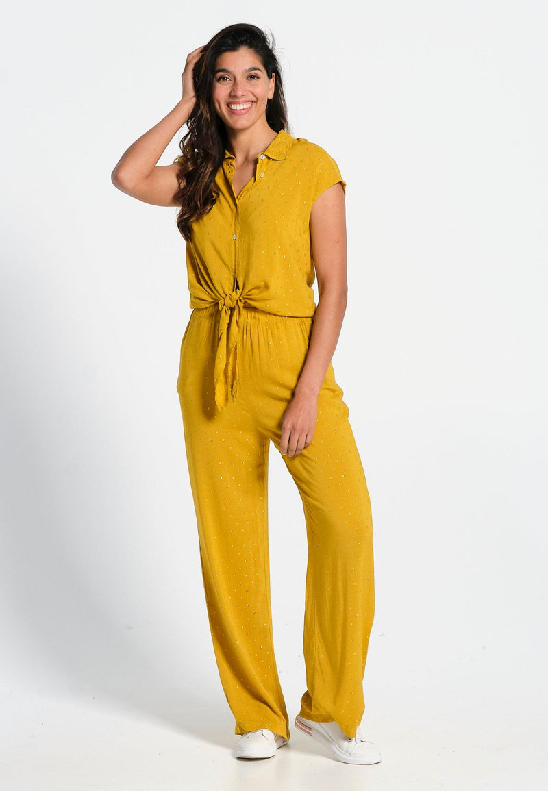 Pantalon femme orange coupe droite avec nœud à la ceinture motif végétal