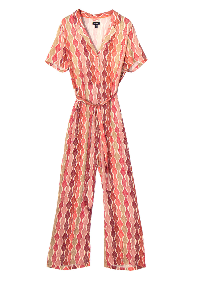 Salopette pantalon femme multicolore manches courtes avec boutonnière motif végétal avec nœud à la taille