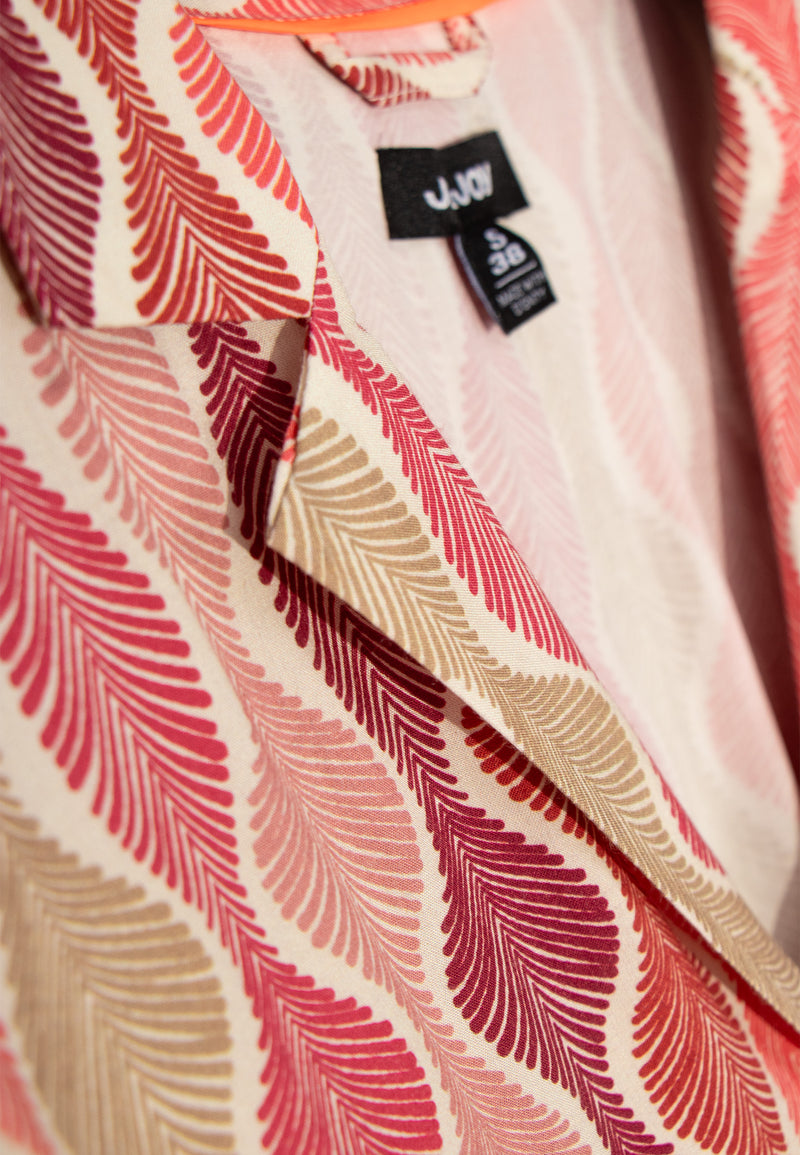 Top femme bleu et rose avec boutonnière et motifs géométriques