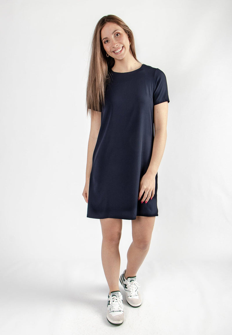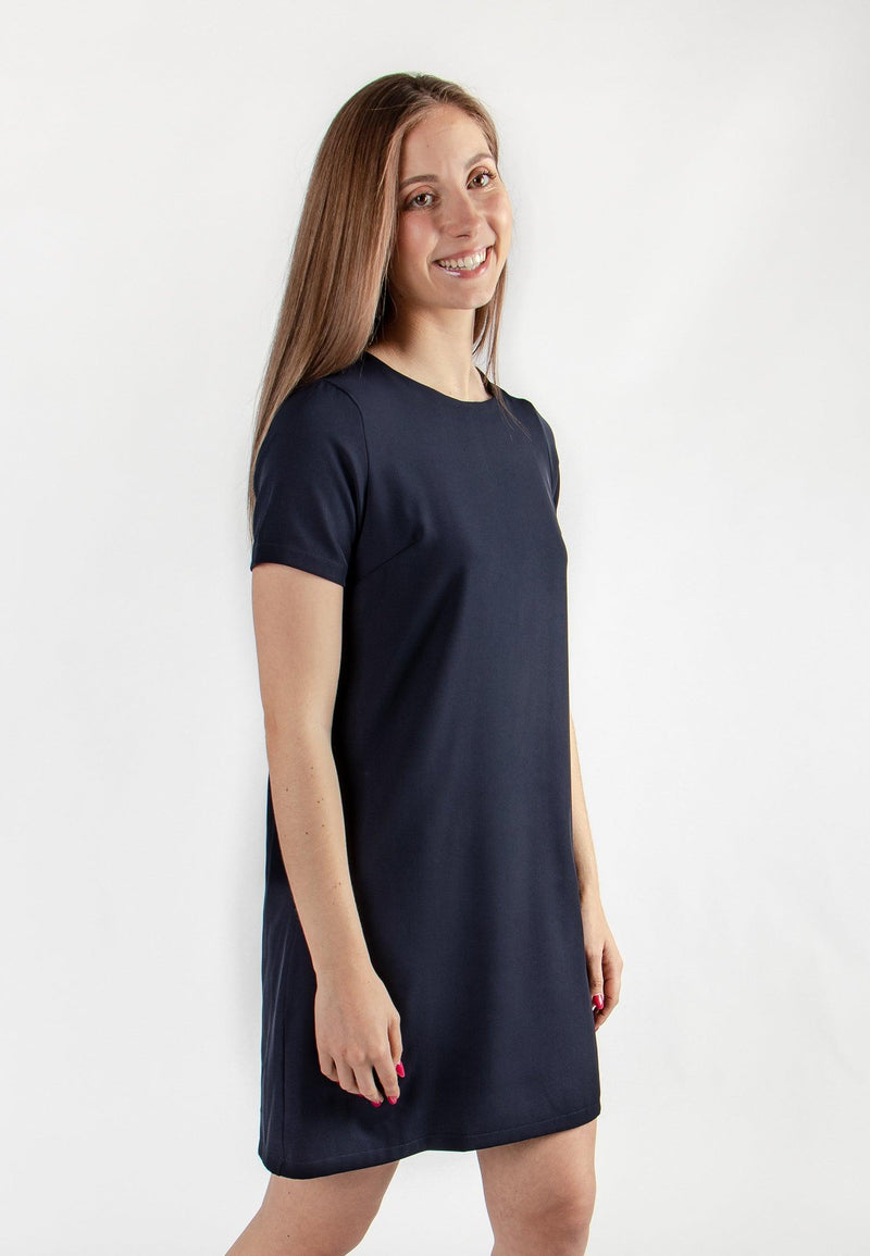 Robe femme courte bleue coupe droite et détails dos