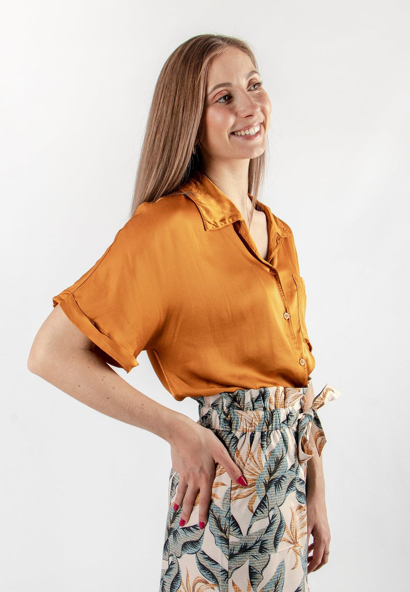 Chemisier femme léger jaune moutarde avec poche sur le cœur