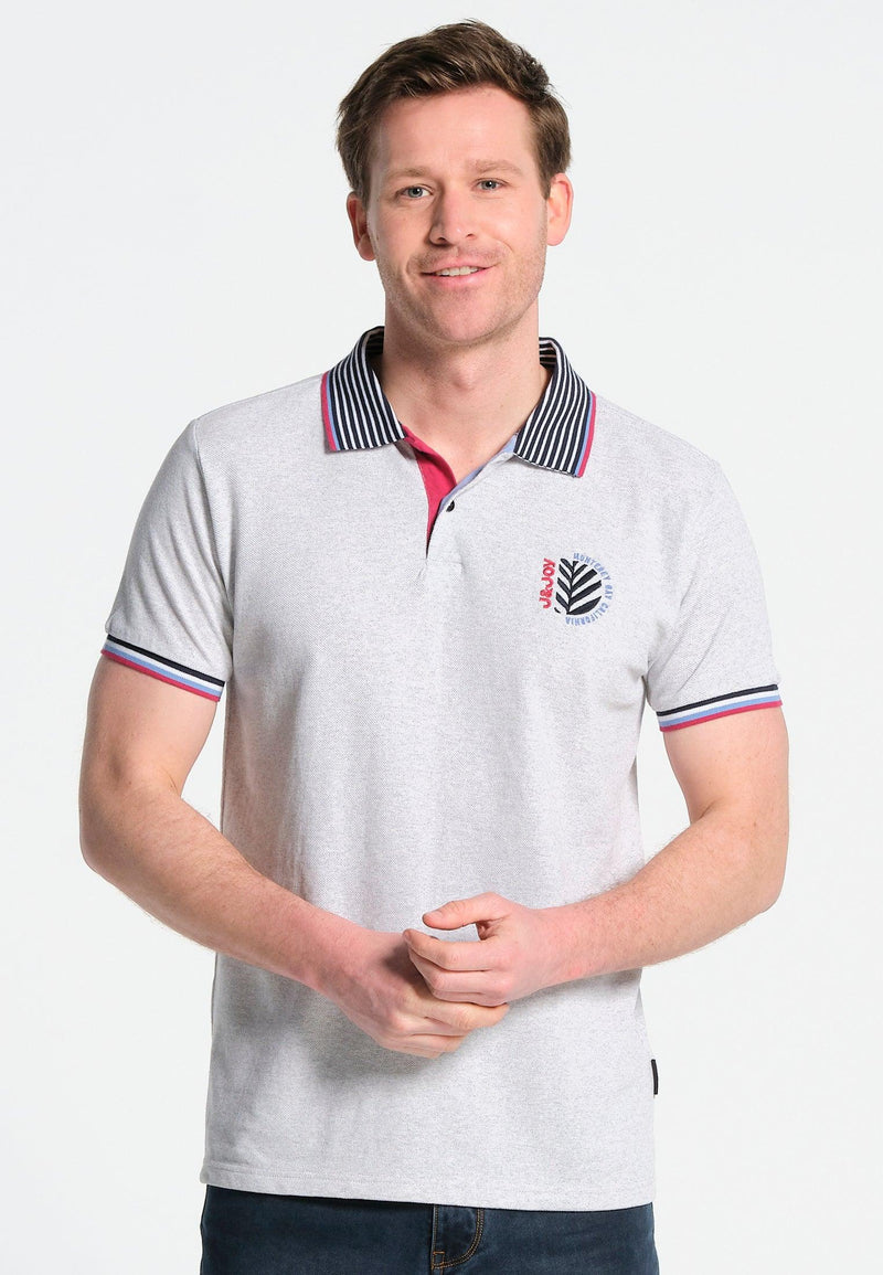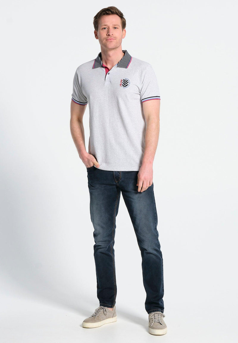 Polo homme gris claire mélange, col ligné bleu marine