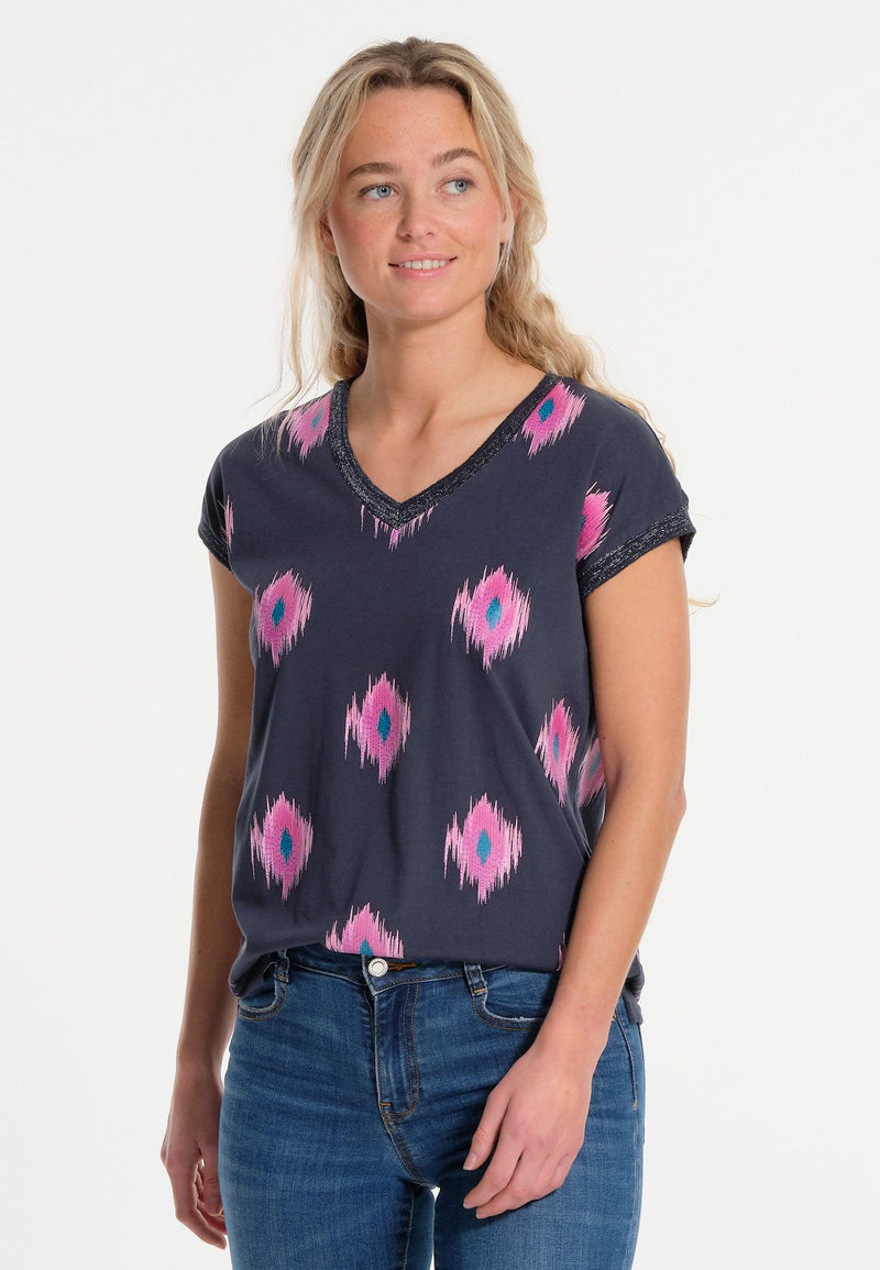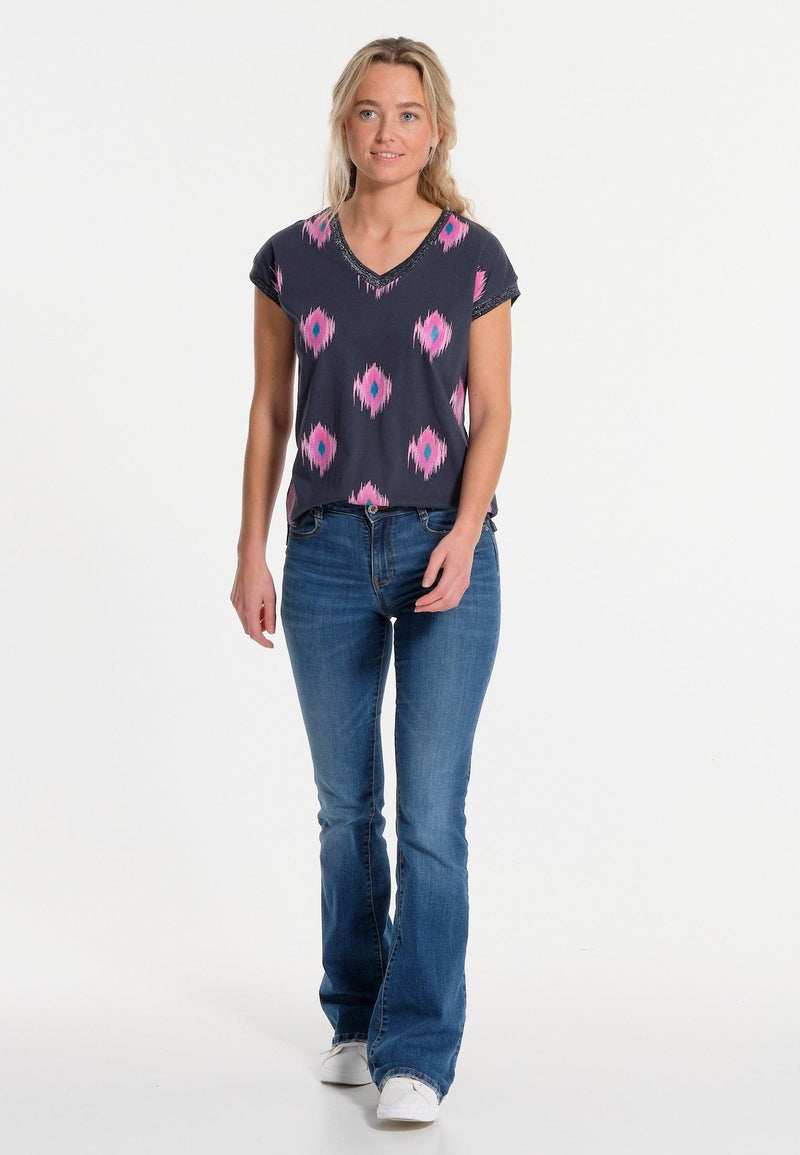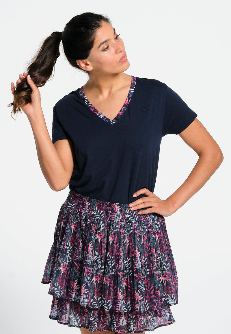 T-Shirt femme bleu marine, col V, liseret imprimé sur le col