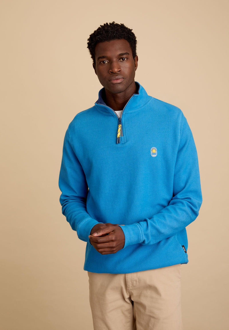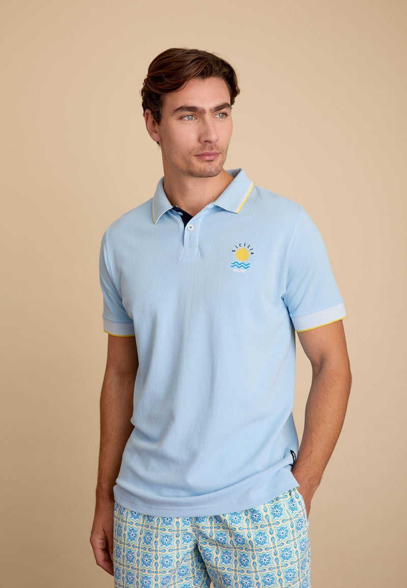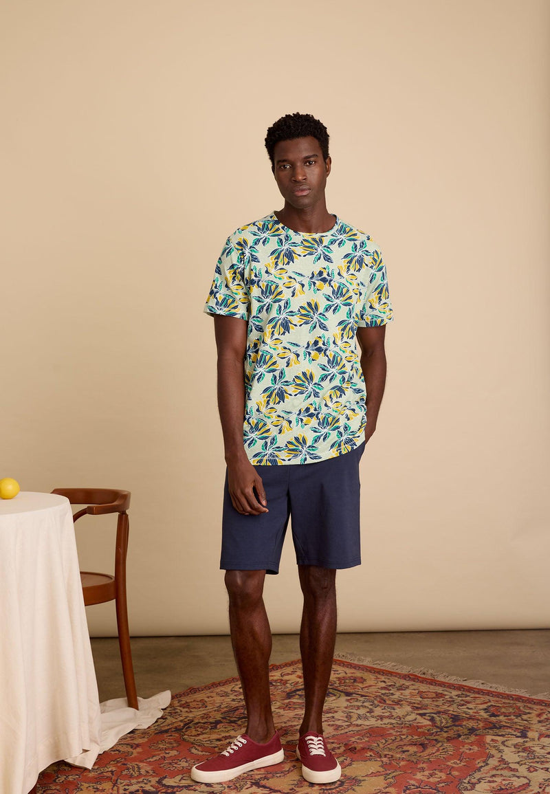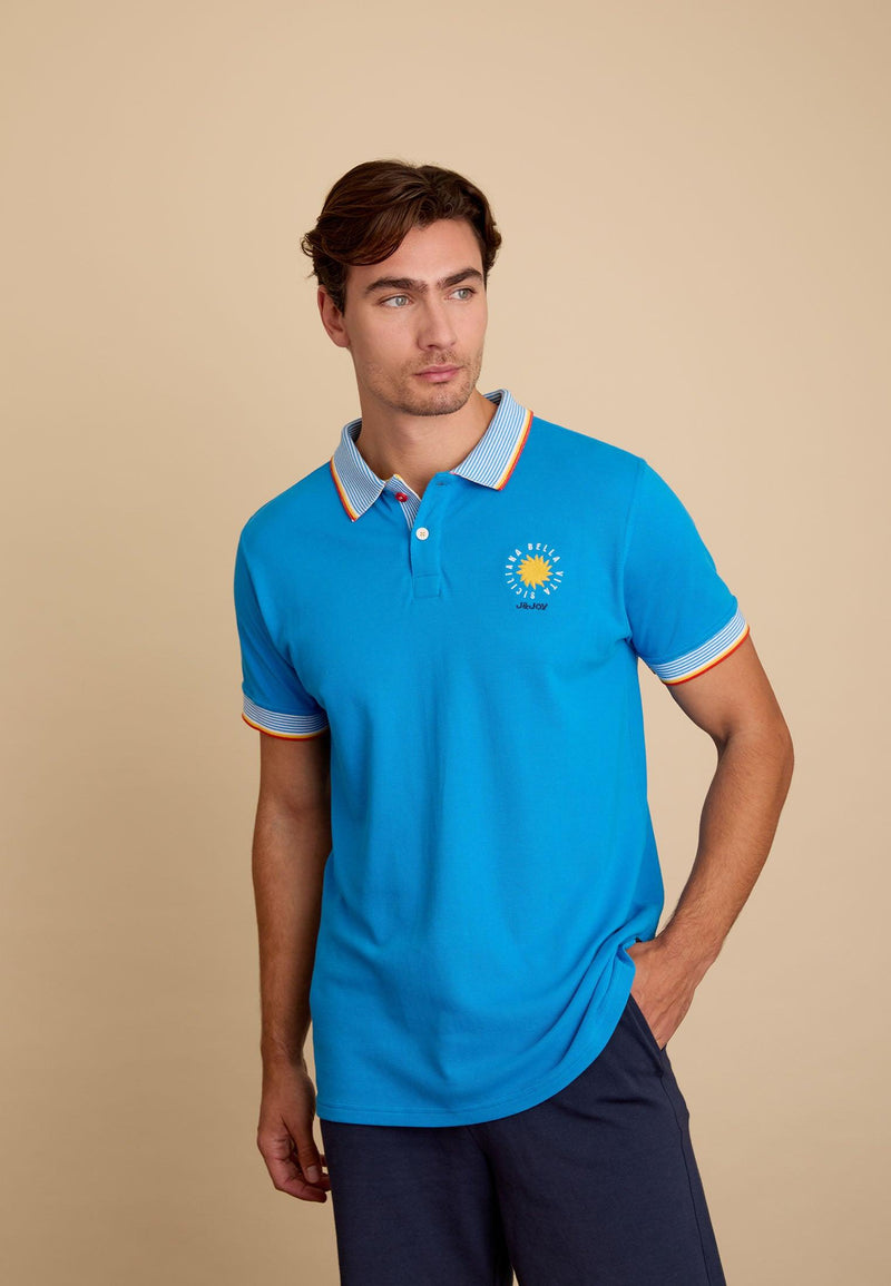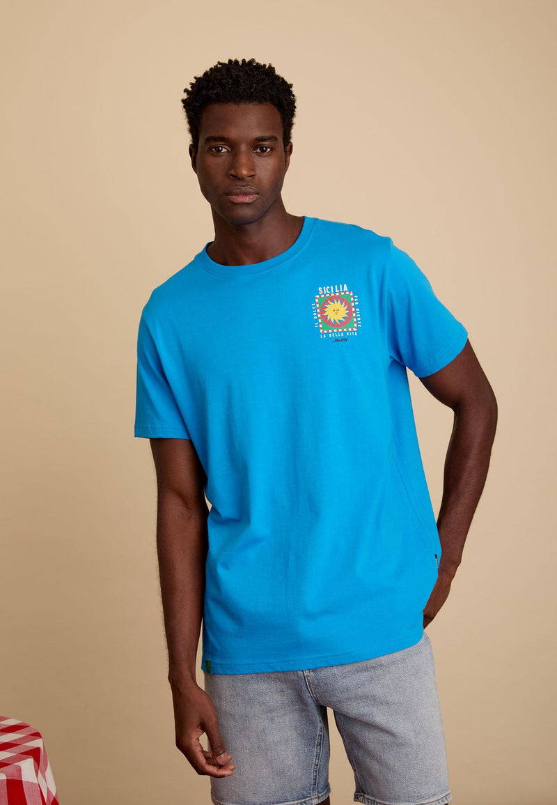 T-shirt homme bleu avec logo soleil sur la poitrine et dans le dos