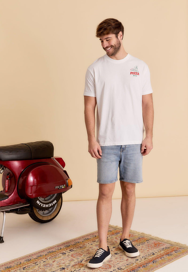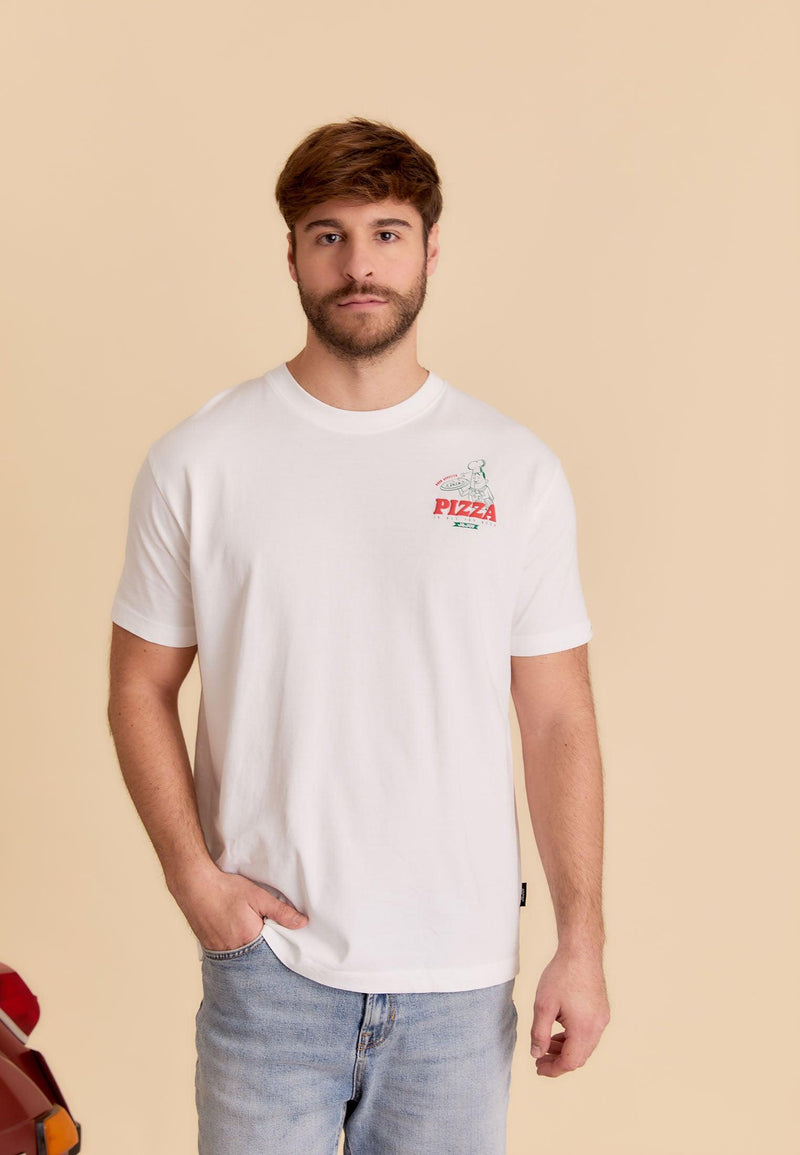 T-shirt homme blanc avec logo pizza sur la poitrine et dans le dos