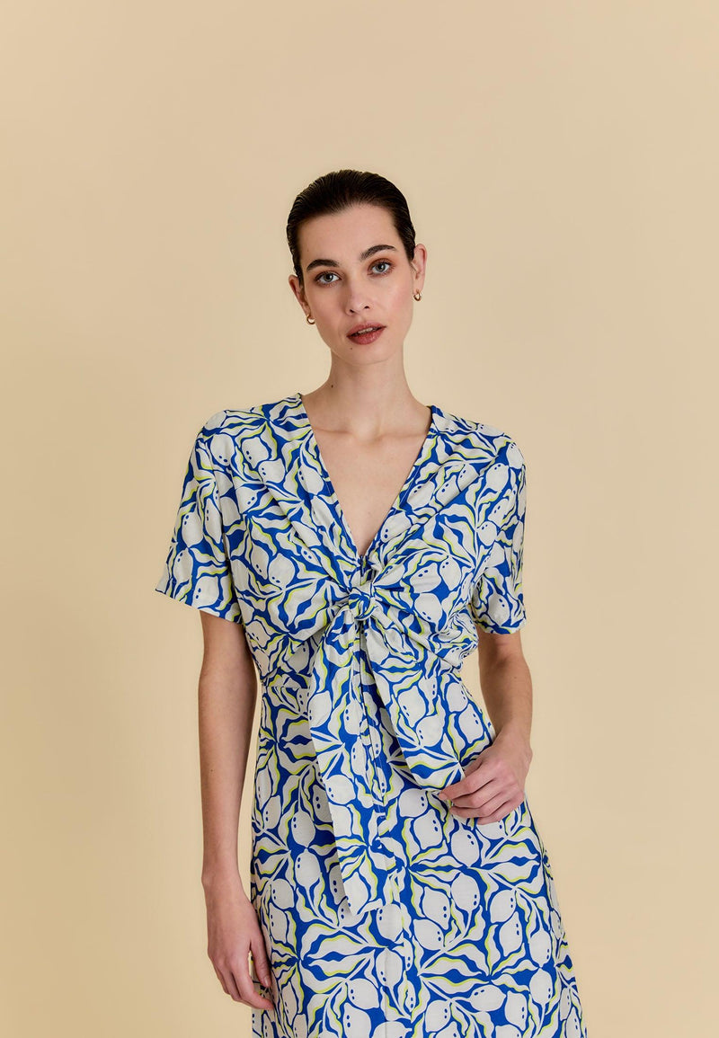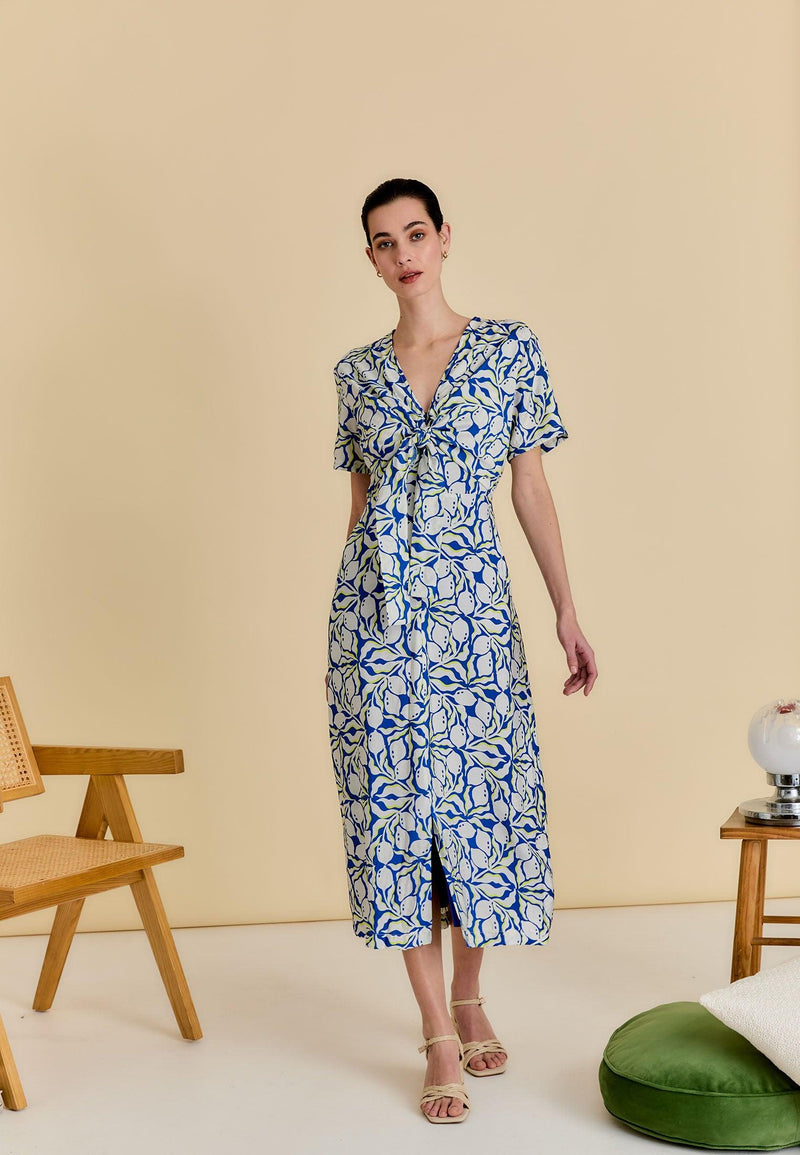 Robe femme blanche motifs citrons fente à l'avant manches courtes