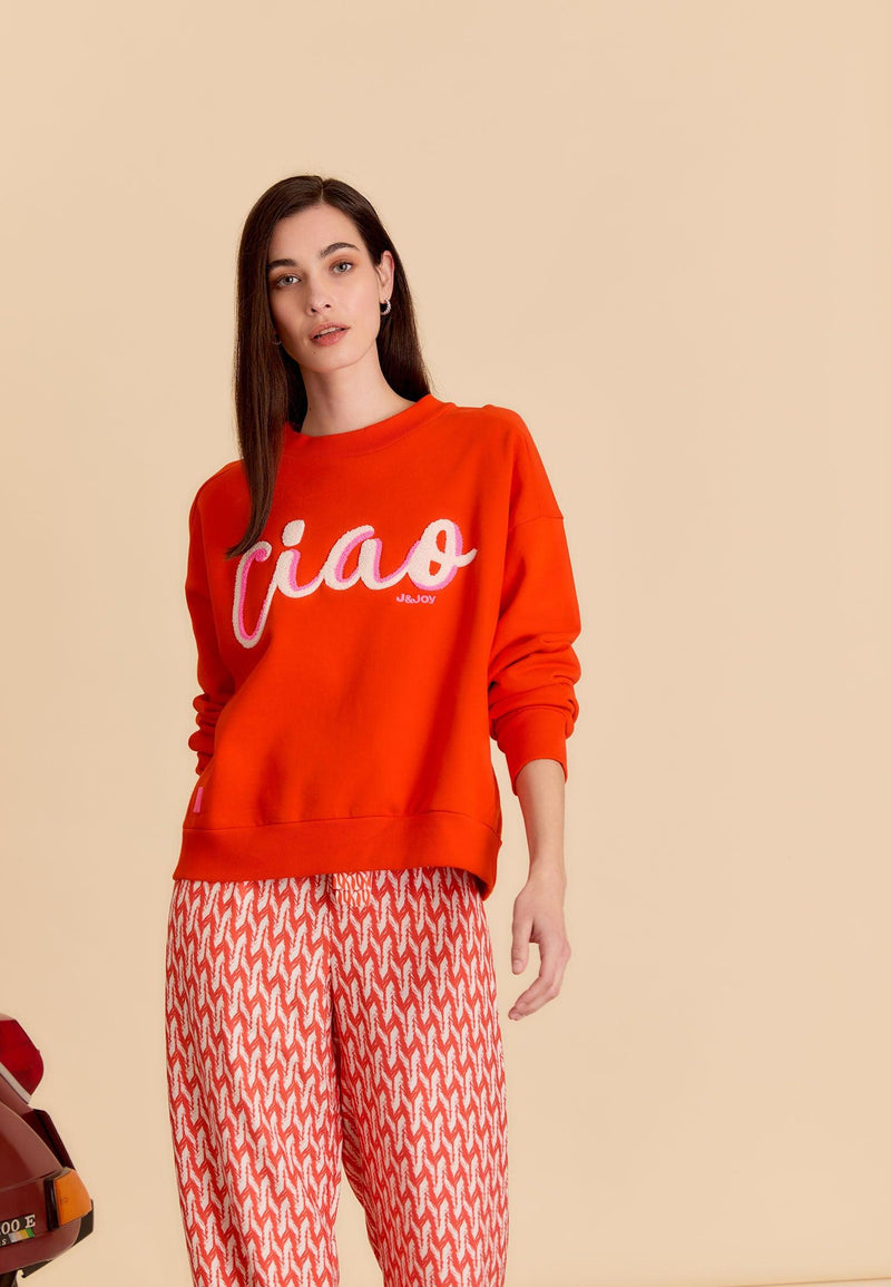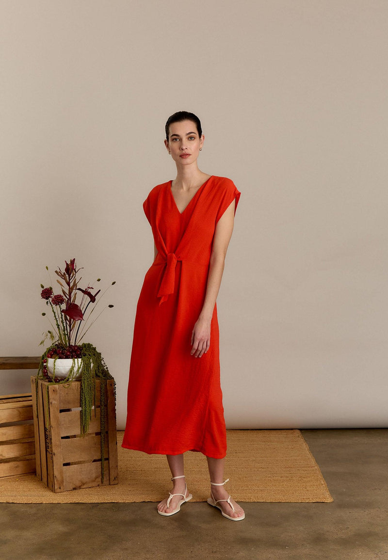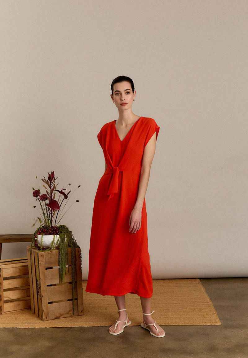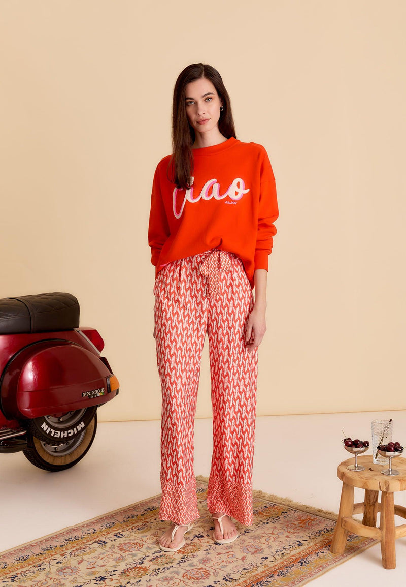 Pantalon femme orange coupe droite avec nœud à la ceinture motif végétal