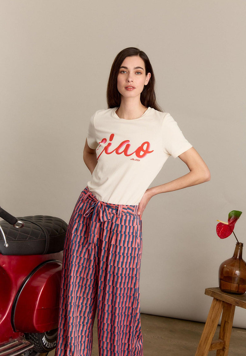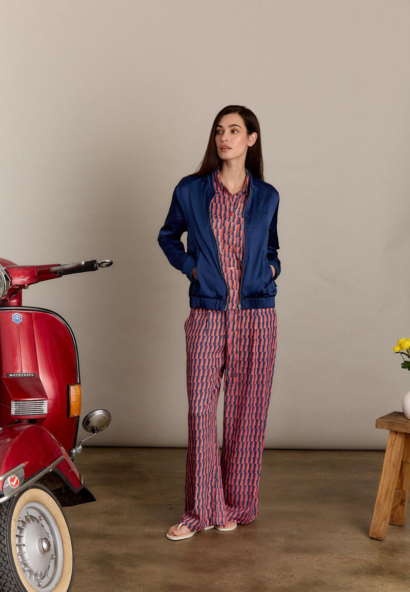 Pantalon femme bleu et rose motifs géométriques avec nœud à la ceinture coupe droite