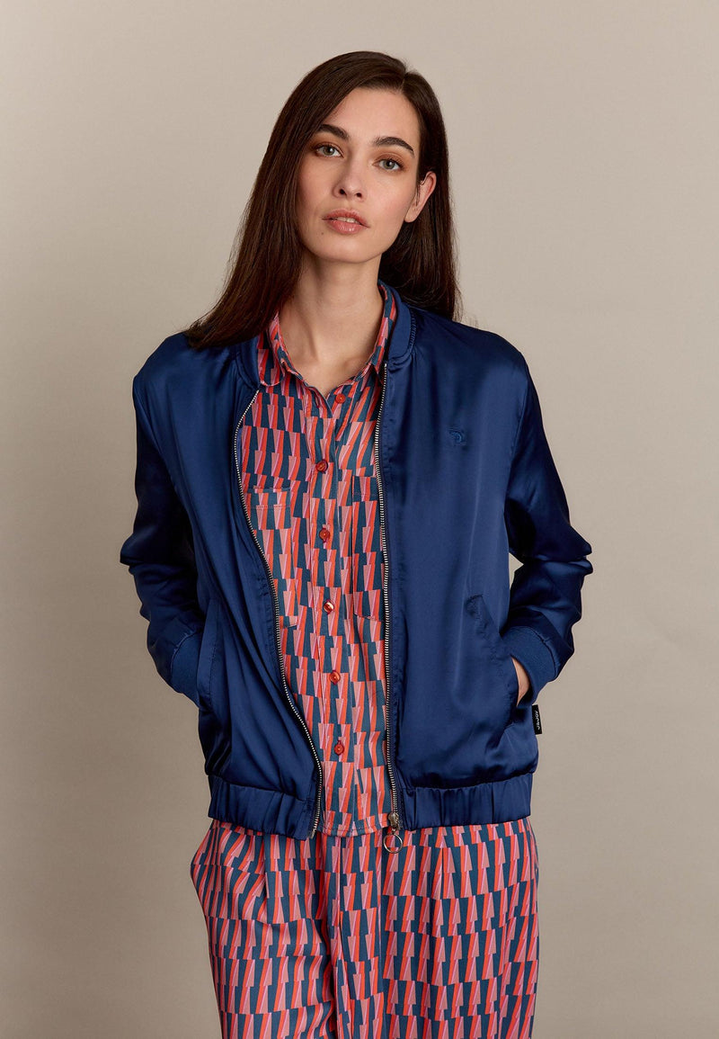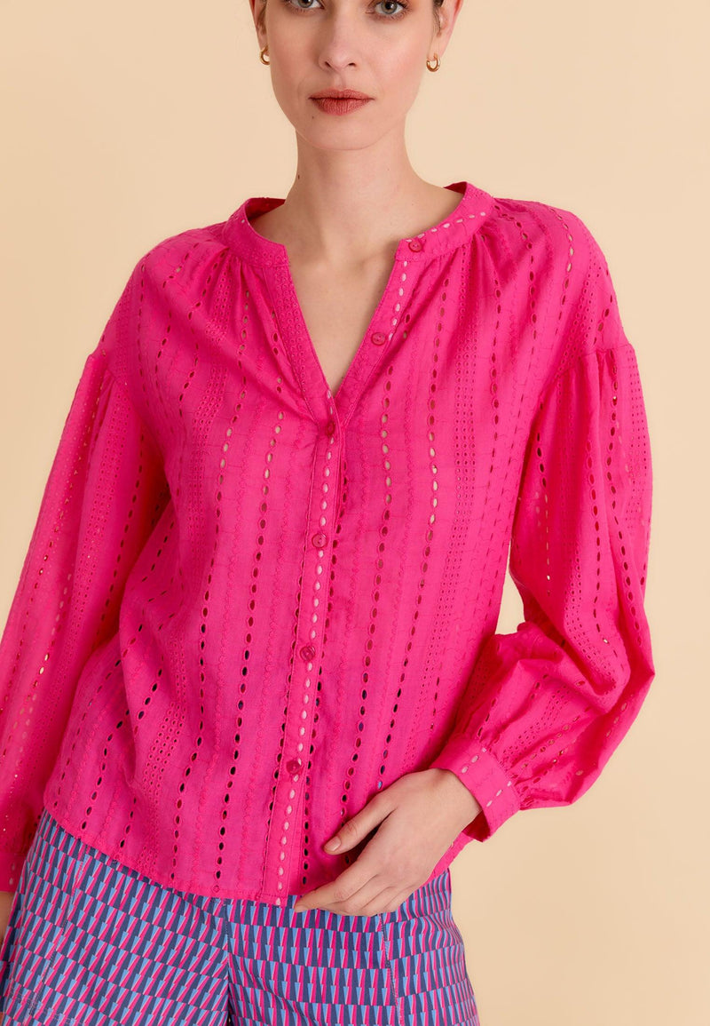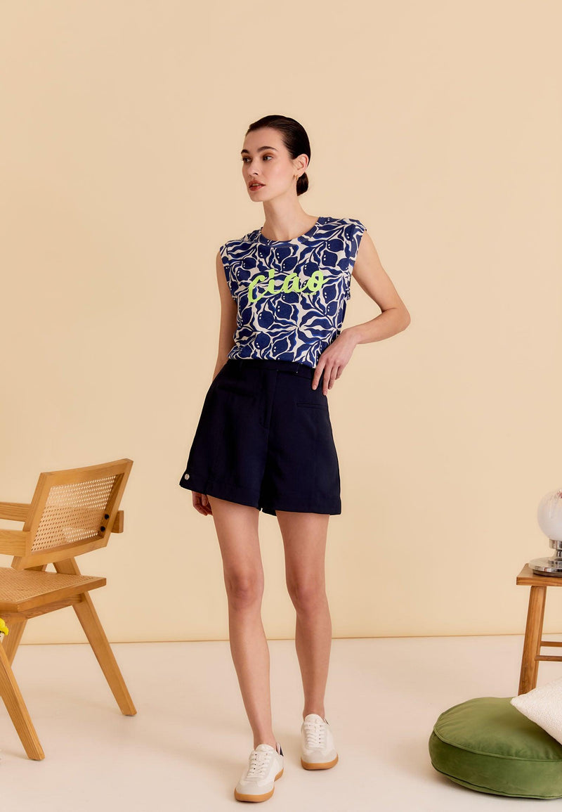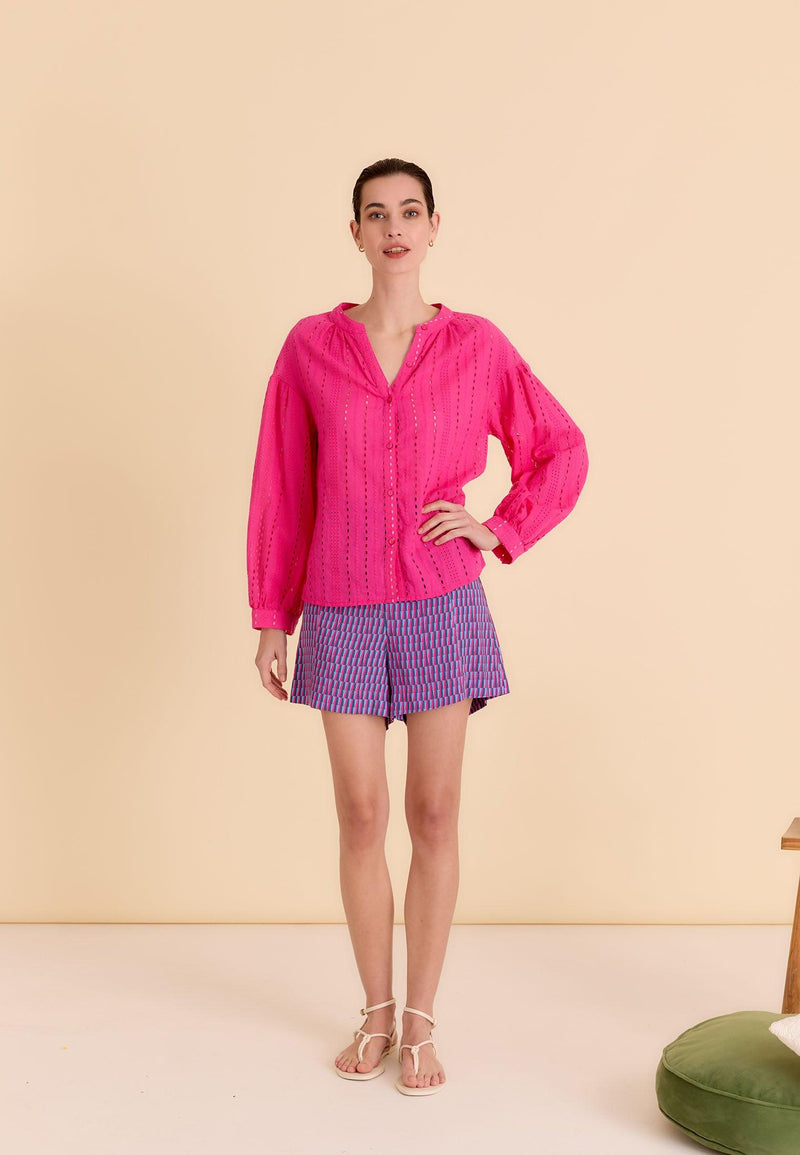 Top femme bleu et rose avec boutonnière et motifs géométriques
