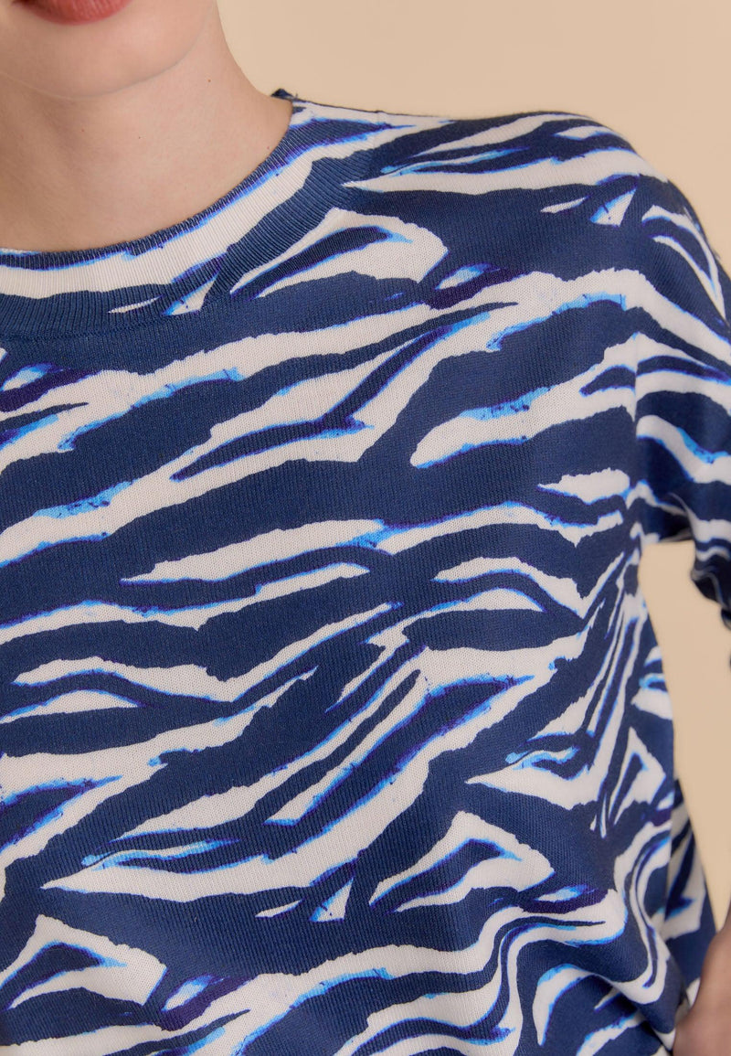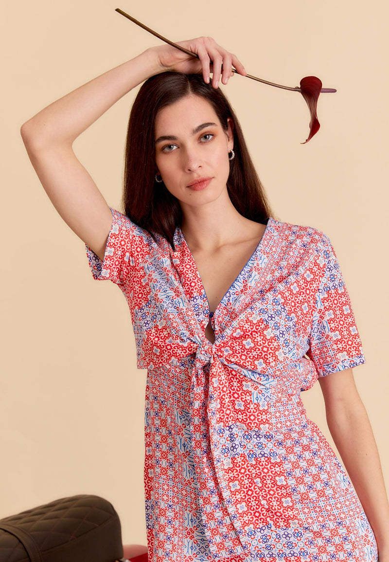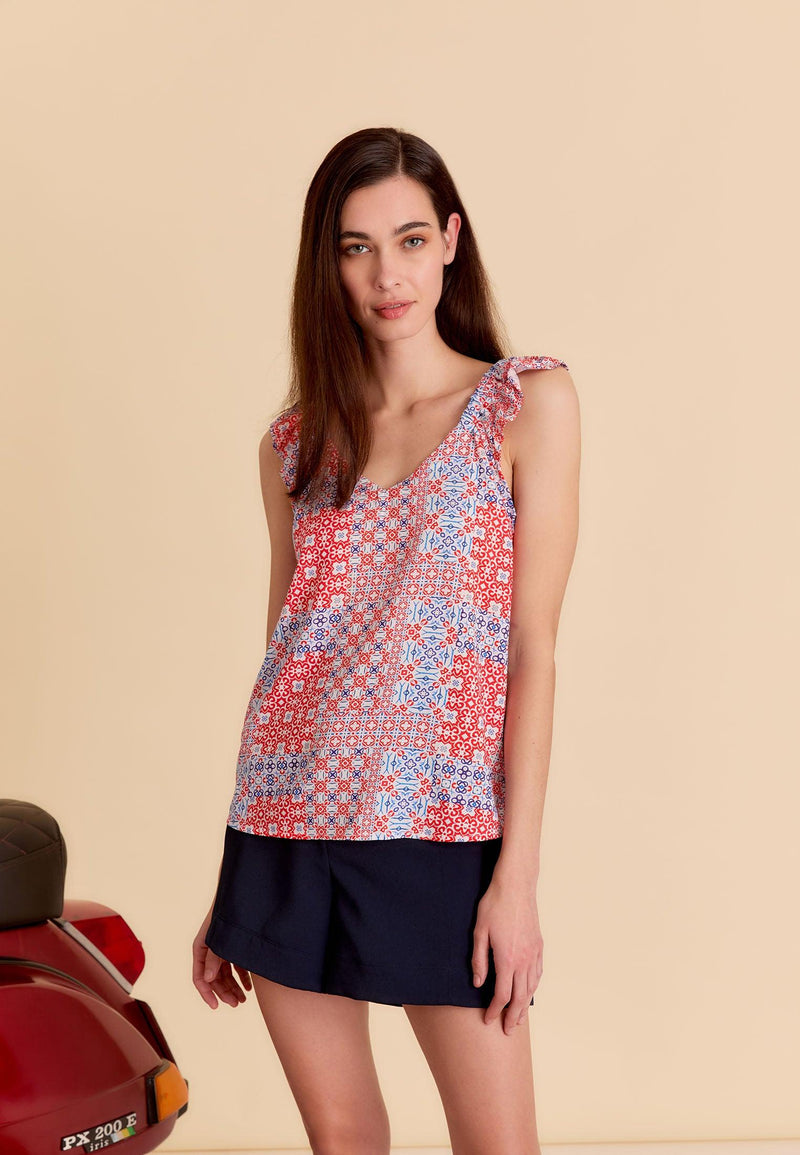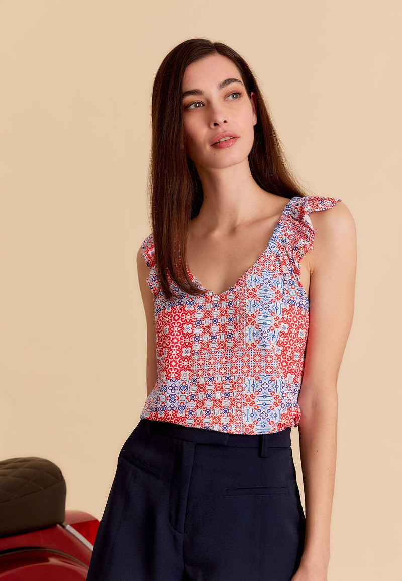 Top femme bleu rouge et blanc à motifs géométriques col en V