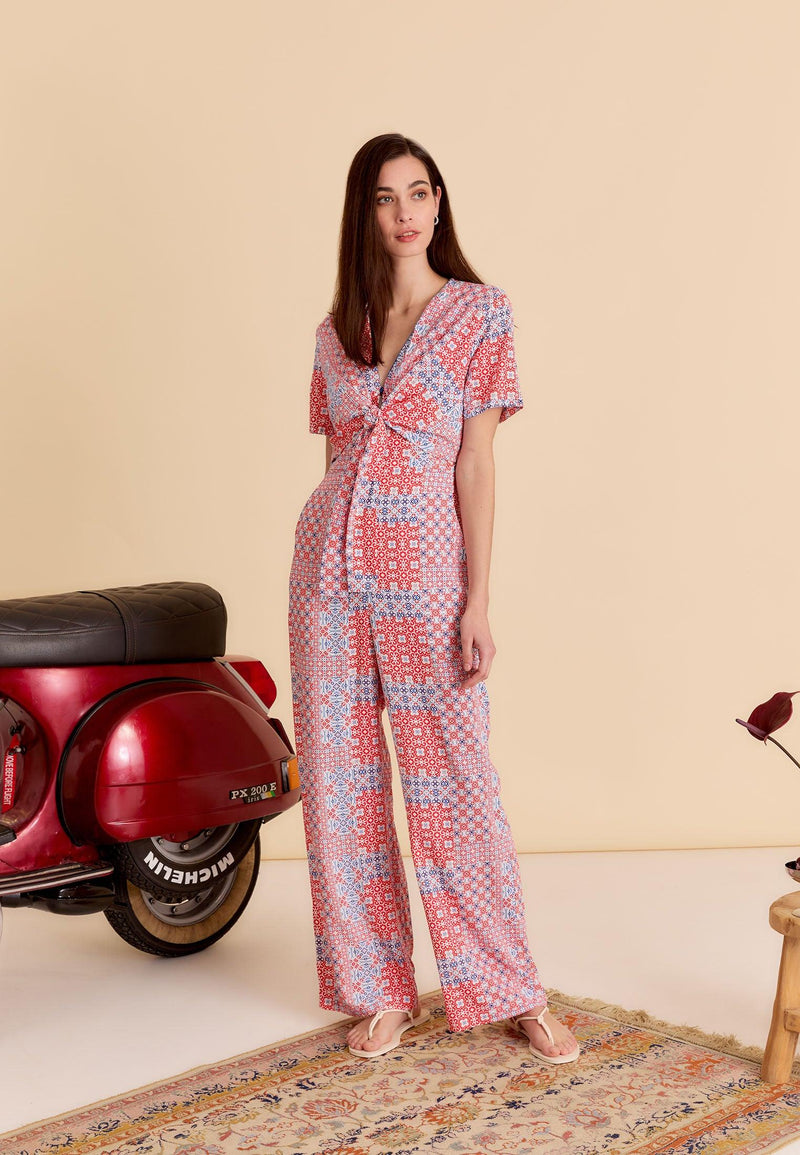 Salopette pantalon femme multicolore manches courtes avec boutonnière motif végétal avec nœud à la taille