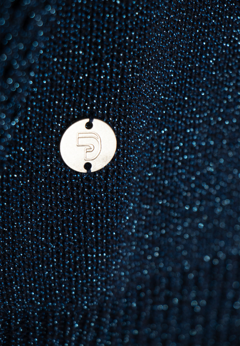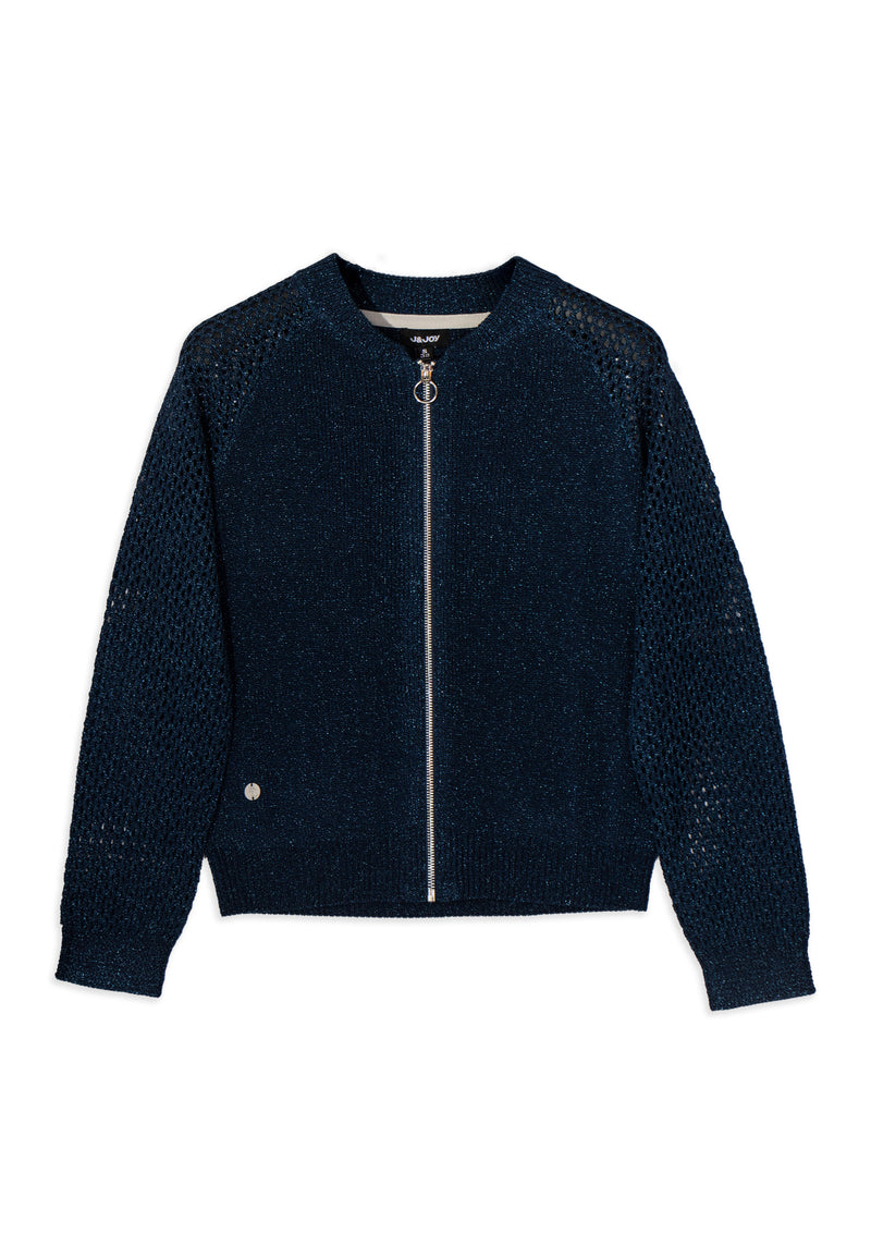 Gilet femme bleu marine légèrement pailleté avec manches tricot ajouré