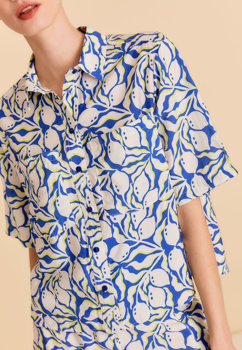 Chemise femme blanc avec motifs citrons avec boutonnière et deux poches poitrine