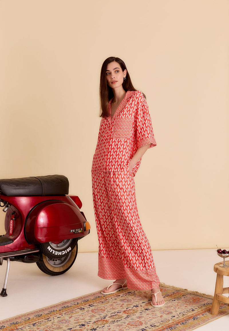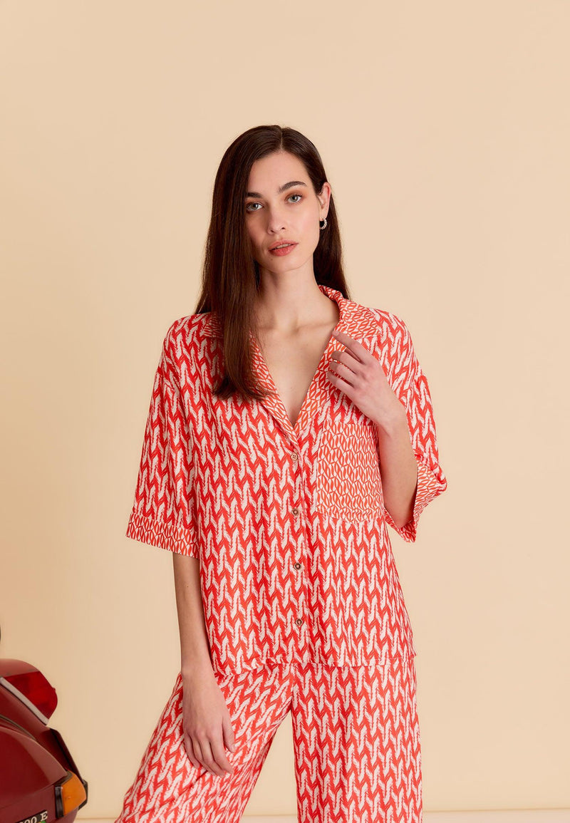 Chemise femme manche courte avec boutonnière et 2 poches poitrine motifs géométriques