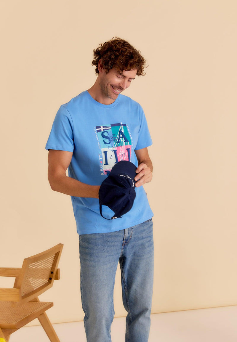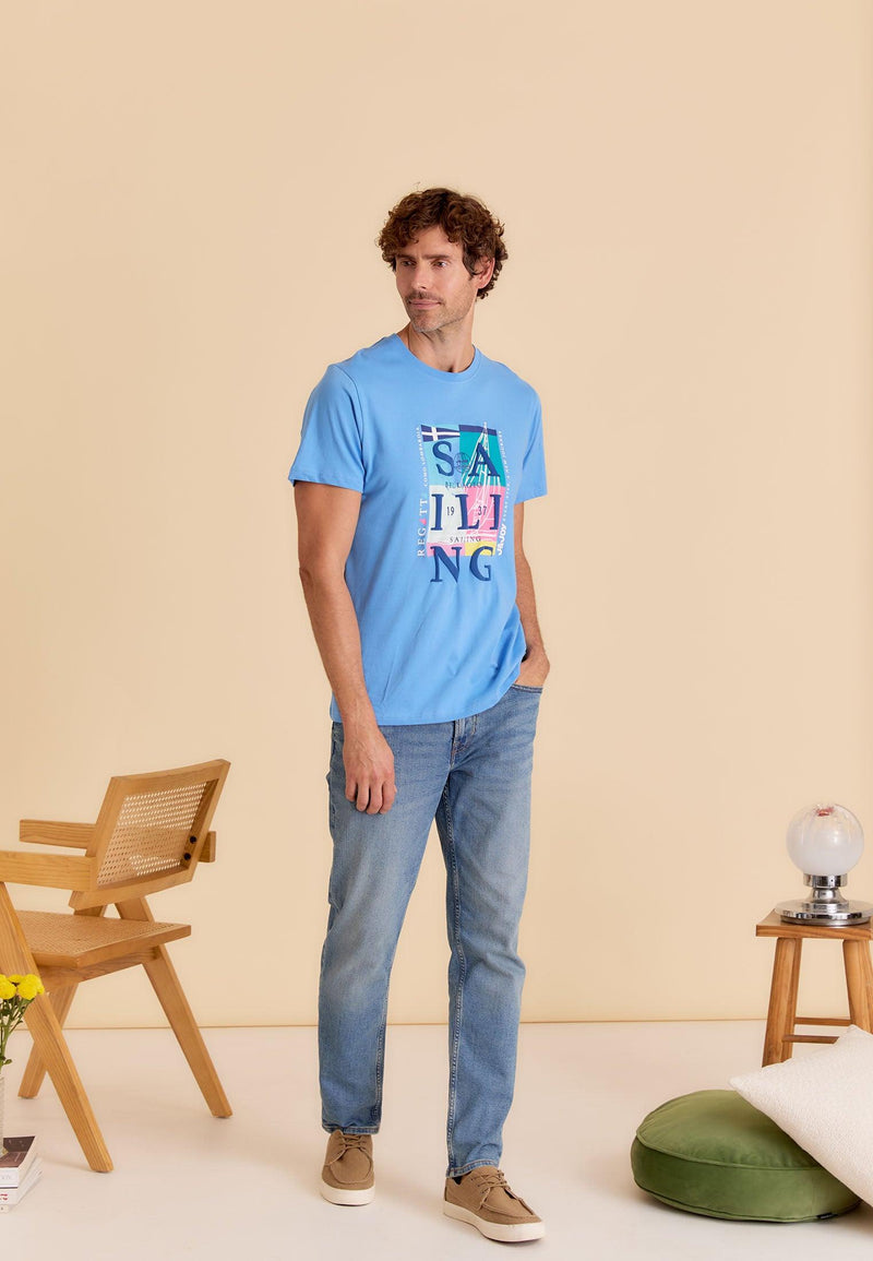 T-shirt homme bleu avec logo soleil sur la poitrine et dans le dos