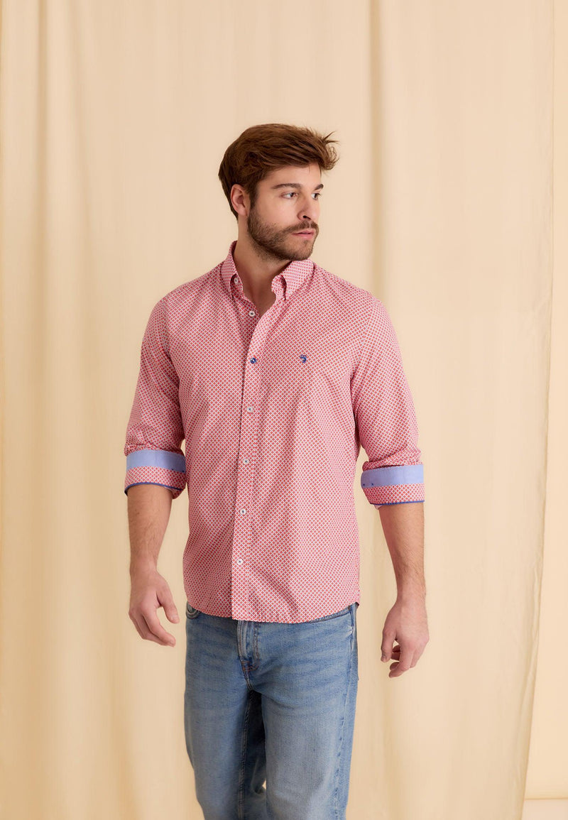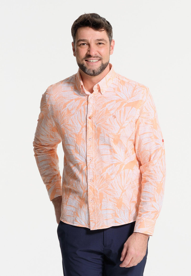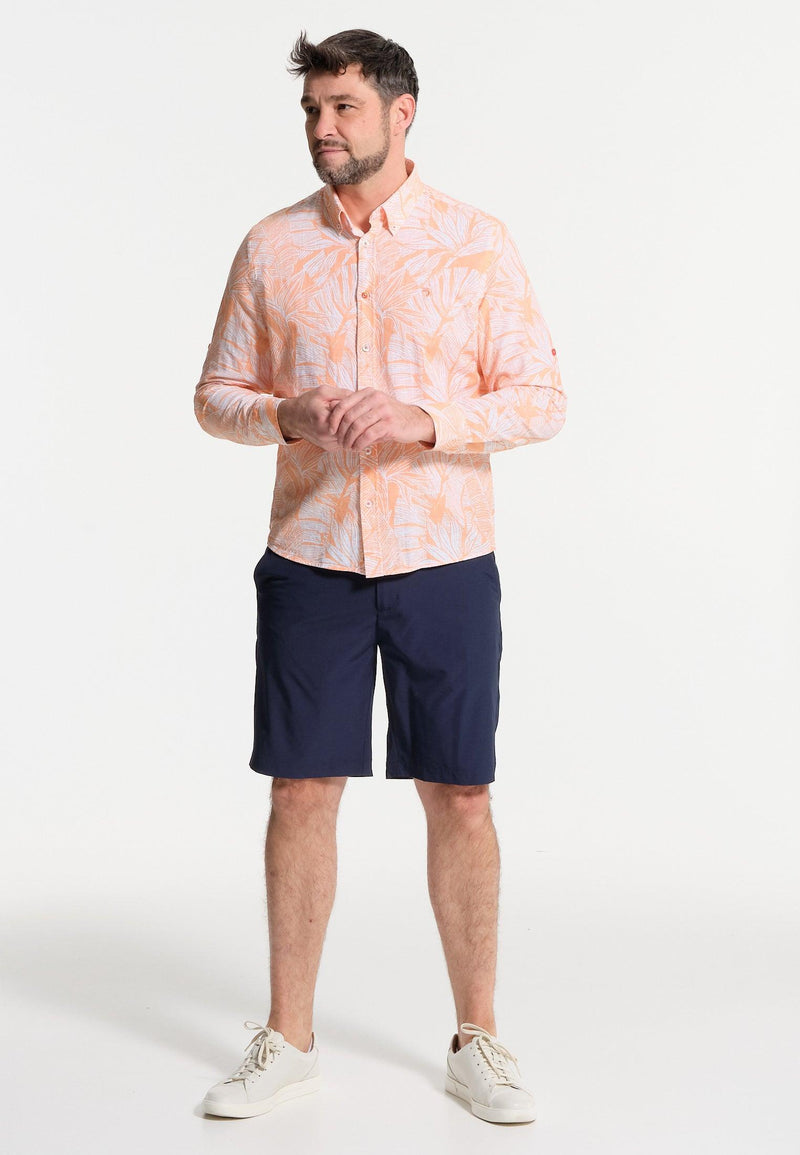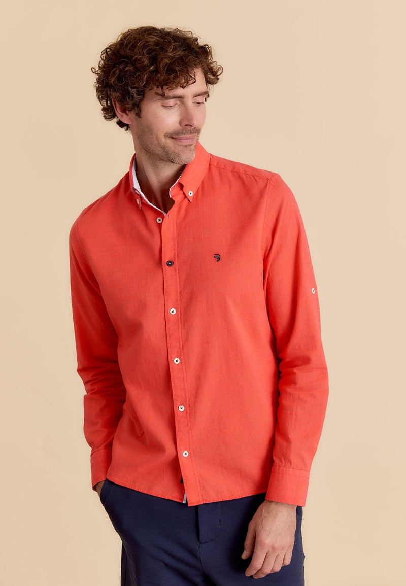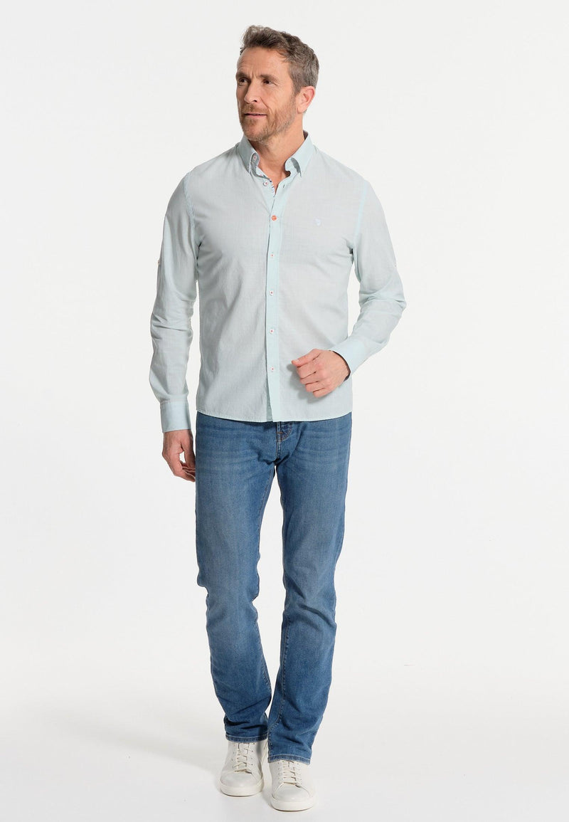 Green long-sleeved shirt for men with roll-up sleeves and Mao collar