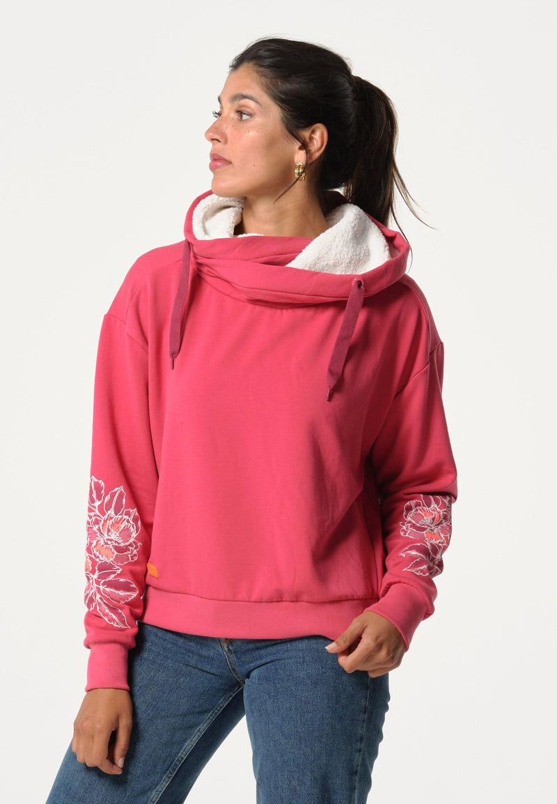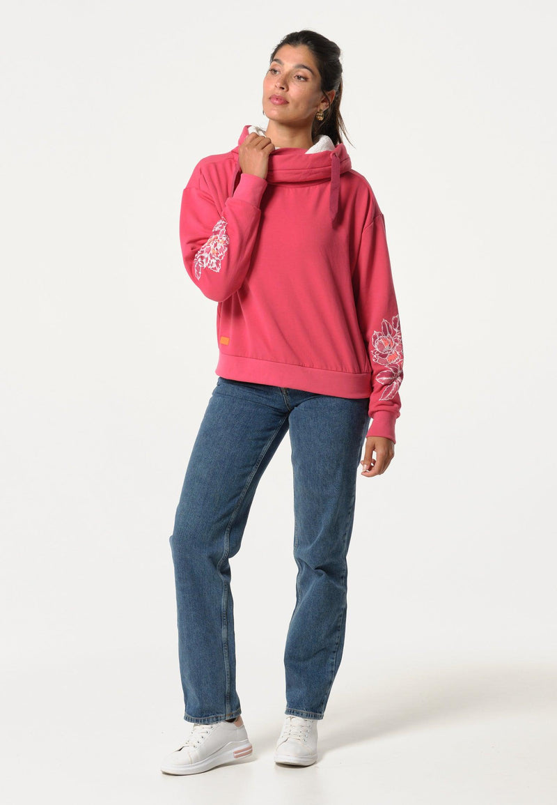 Women's pink sweatshirt with floral print on the sleeves