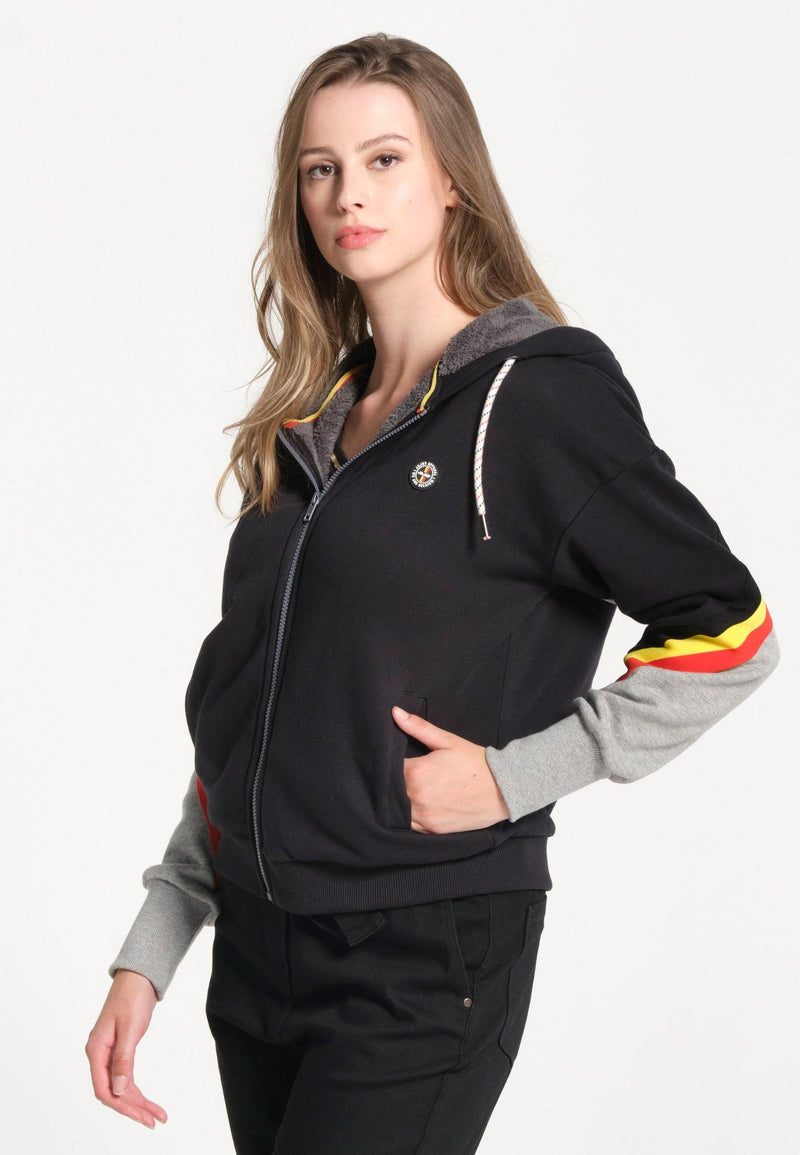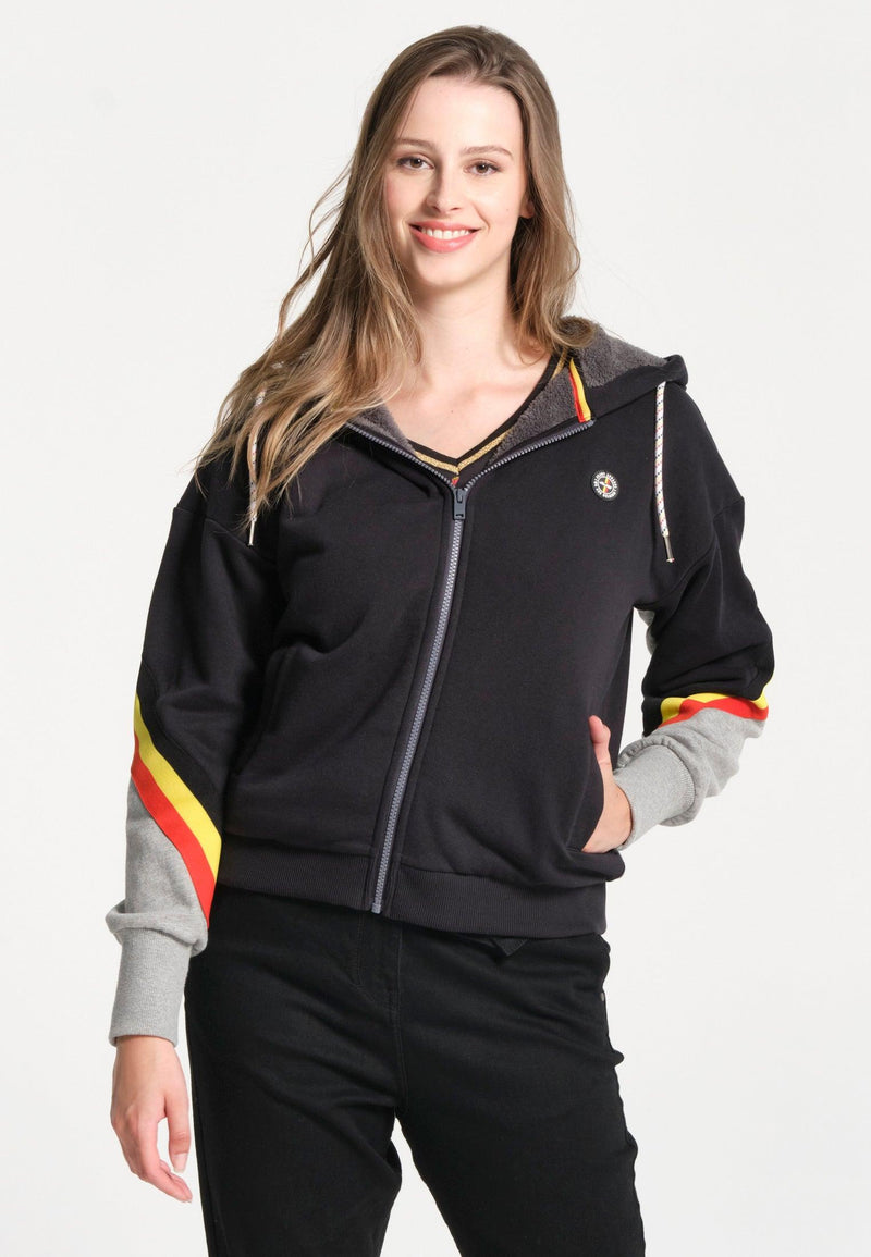 Women's black zipped sweatshirt with hood and black, yellow and red finishes