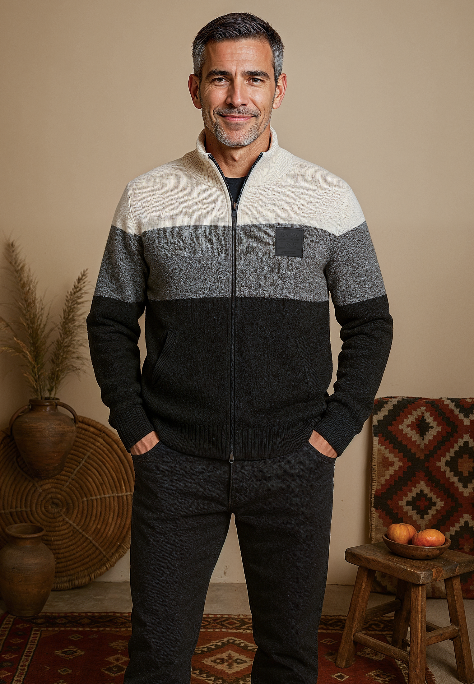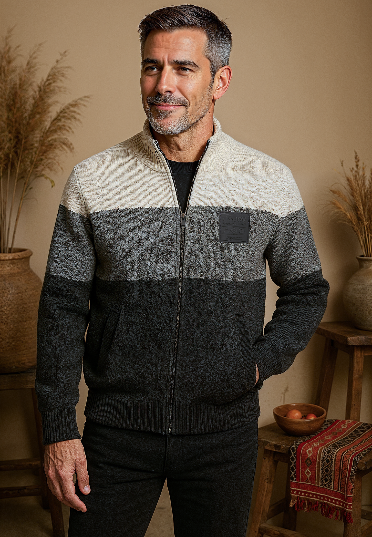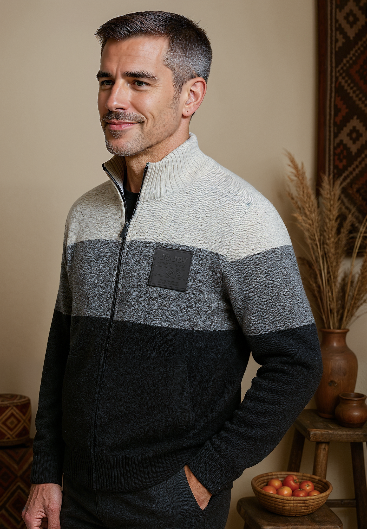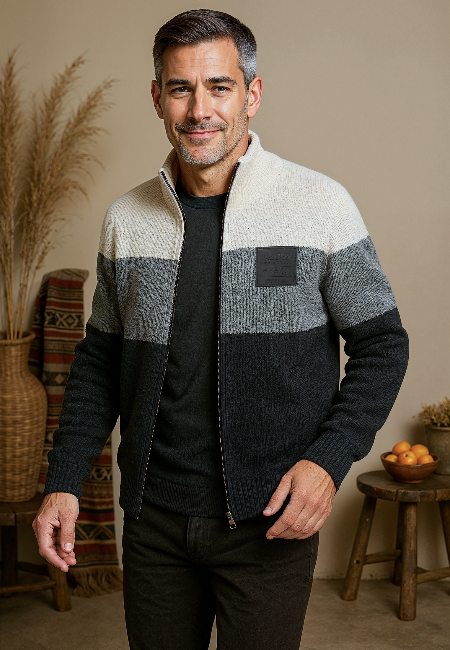 Optez pour un look dynamique et décontracté avec ce pull homme tricolore zippé, inspiré par l'énergie envoûtante de Santiago. Confectionné avec un mélange de 39% polyester, 33% coton recyclé, 19% acrylique et 9% nylon, ce pull offre à la fois confort et durabilité. Sa coupe droite et ses détails tricolores apportent une touche de modernité, tandis que l'ouverture zippée avec finitions contrastées et le col montant ajoutent une note sophistiquée. Les bords et poignets côtelés stretch offrent un ajustement parfait, et les deux poches latérales ajoutent une touche pratique. Le logo J&JOY gommé sur le cœur et l'intérieur du col contrasté apportent une touche d'authenticité et de style. Avec ses manches longues, ce pull est idéal pour affronter les journées fraîches avec élégance. Commandez dès maintenant pour ajouter une pièce polyvalente et tendance à votre garde-robe.