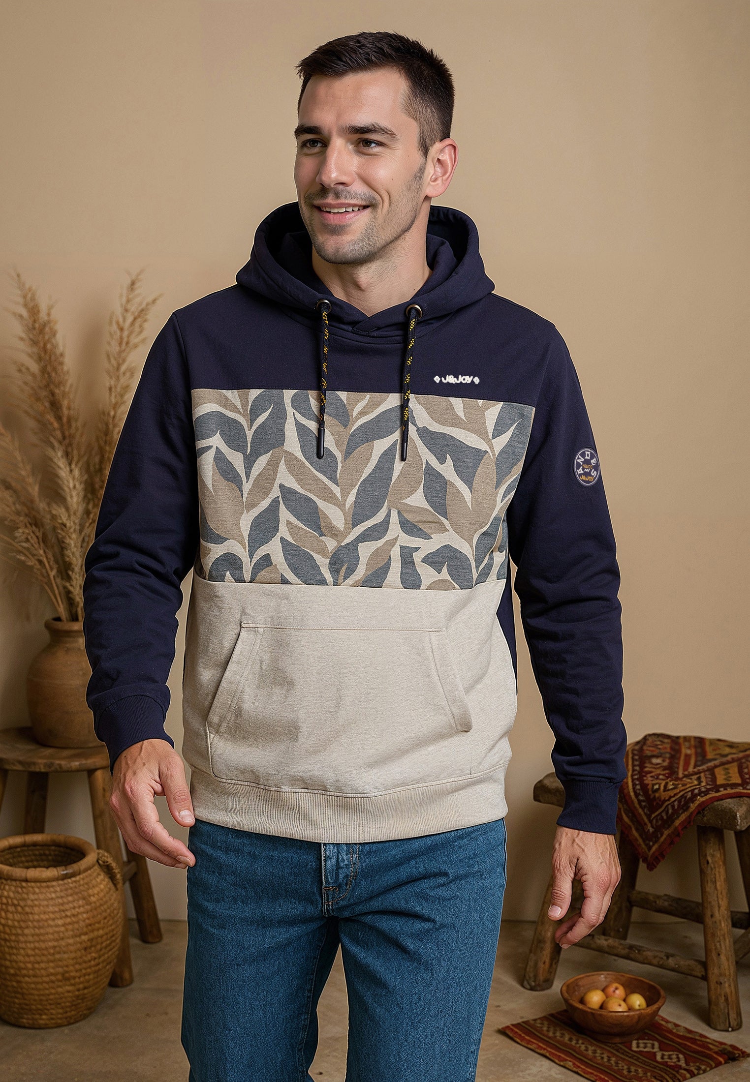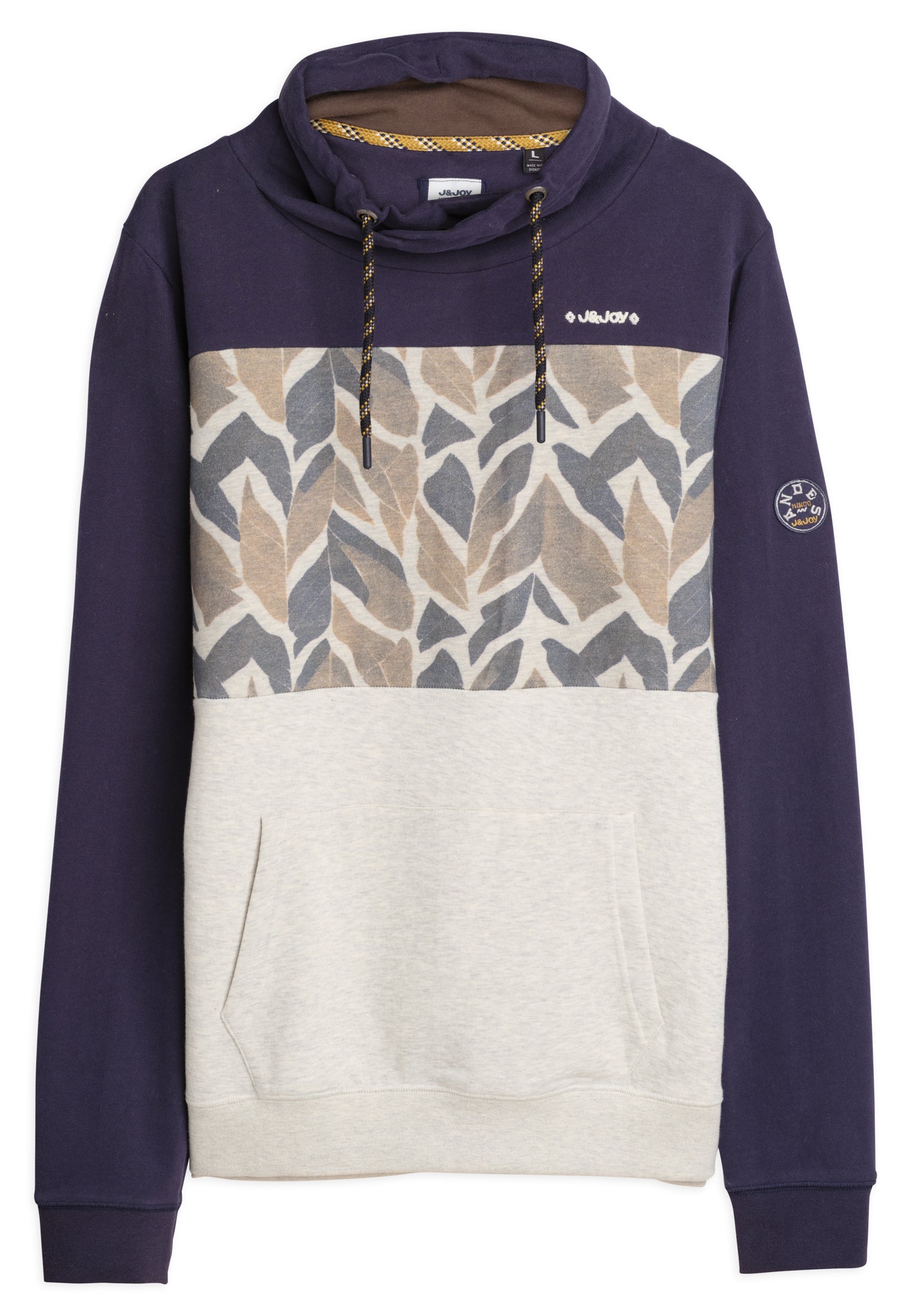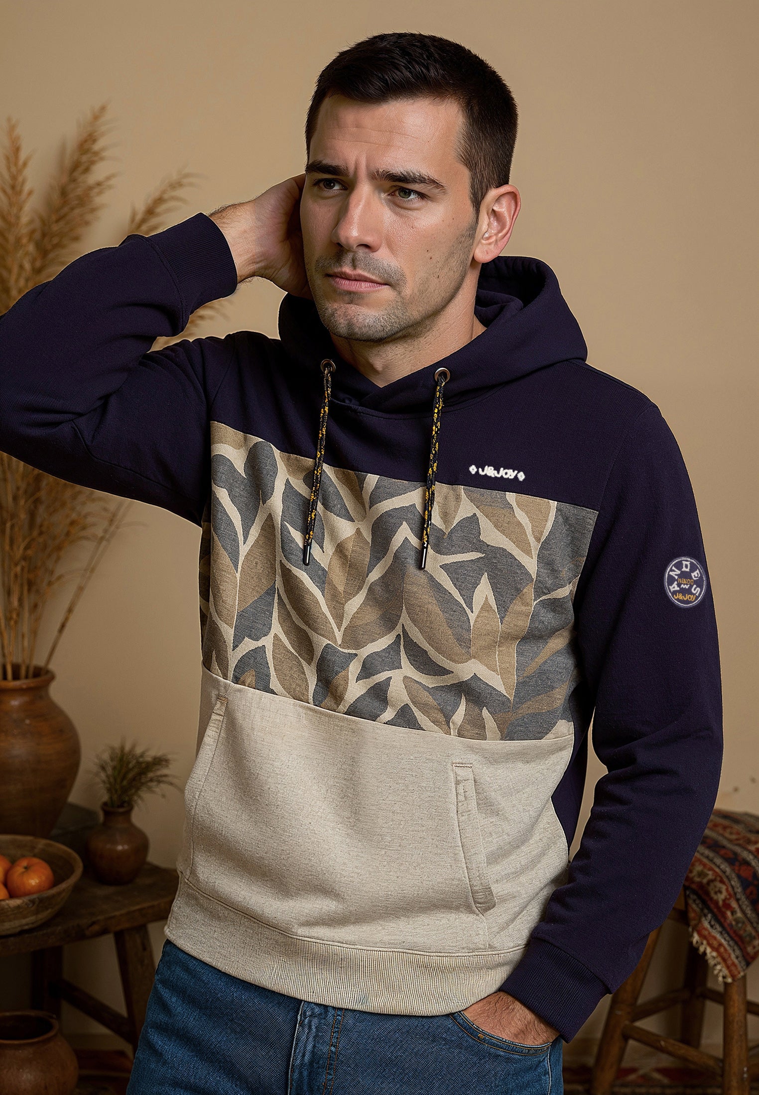 Optez pour un look casual et tendance avec ce sweatshirt homme tricolore inspiré par l'ambiance naturelle de Mindo. Fabriqué à partir de 98% de coton et 2% de polyester, ce sweatshirt offre un mélange de confort et de durabilité. Sa coupe droite et son motif tricolore avec texture végétale lui confèrent une allure moderne et originale. Le col haut avec cordon de serrage contrasté ajoute une touche de style, tandis que les bords côtelés et stylisés ainsi que les poignets côtelés stretch offrent un confort supplémentaire. Les manches longues et la poche kangourou complètent le look décontracté de ce sweatshirt. Enfin, le logo J&JOY brodé sur le cœur témoigne de l'authenticité de ce vêtement. Commandez dès maintenant et ajoutez une pièce unique à votre garde-robe.