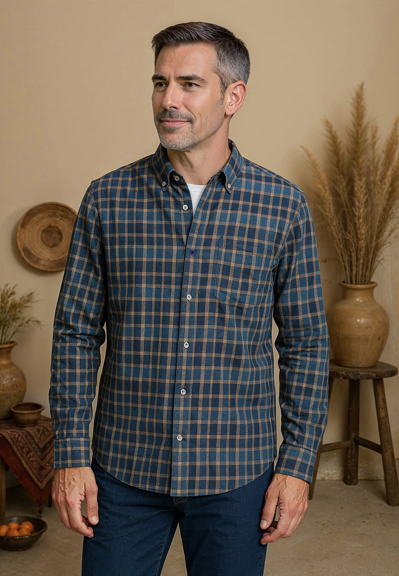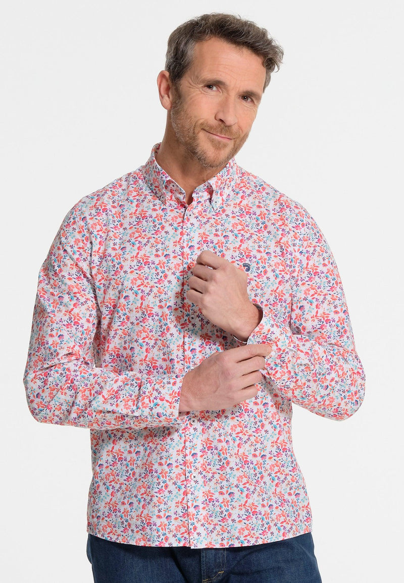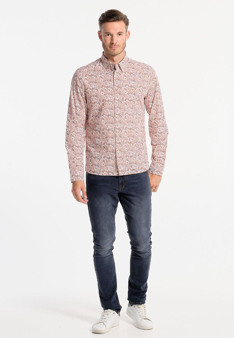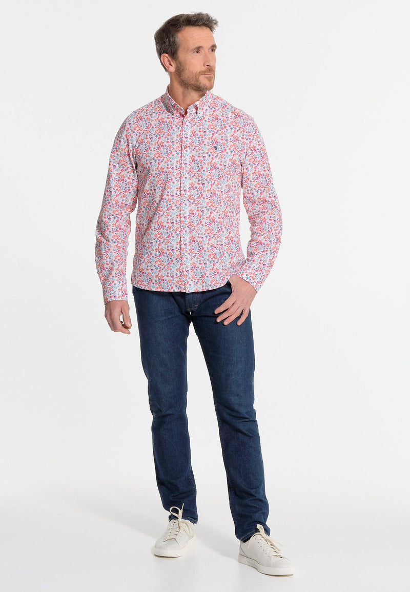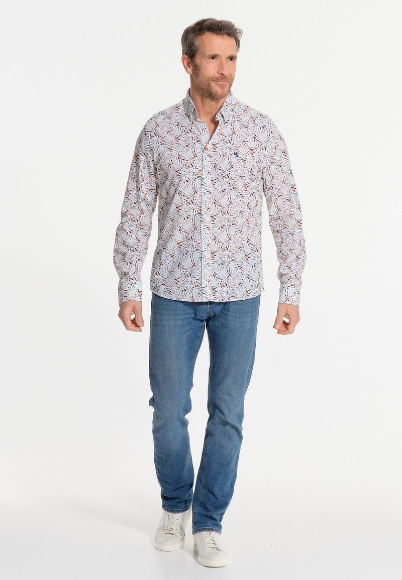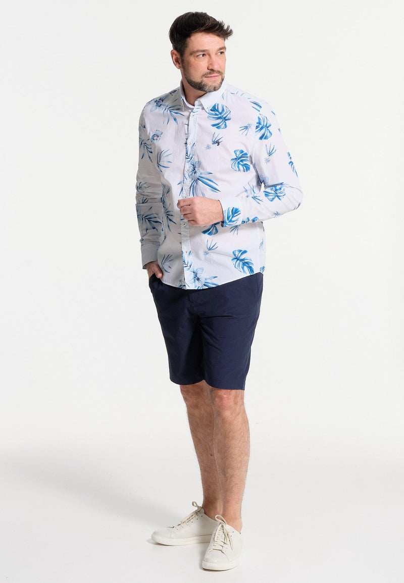 Chemise homme blanche et bleue longues manches avec motif végétal