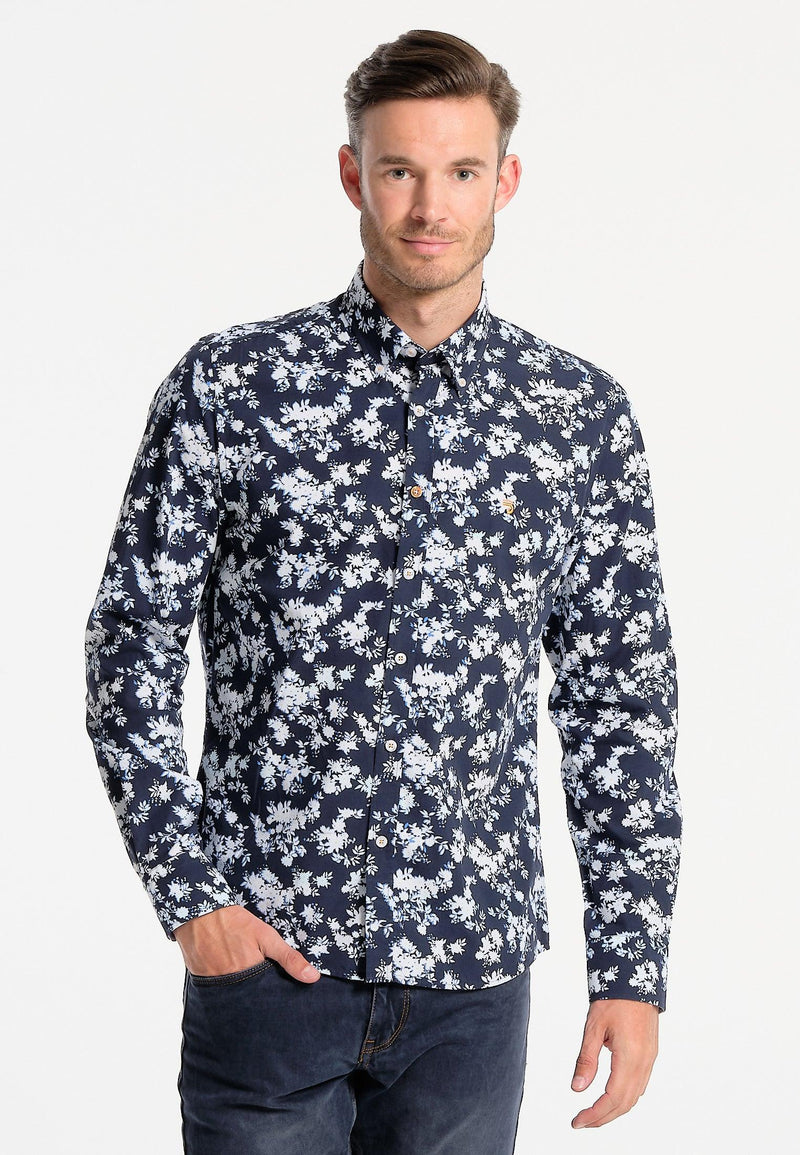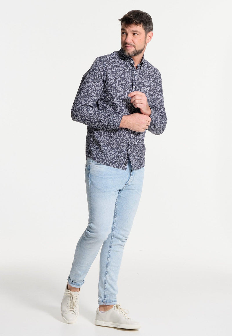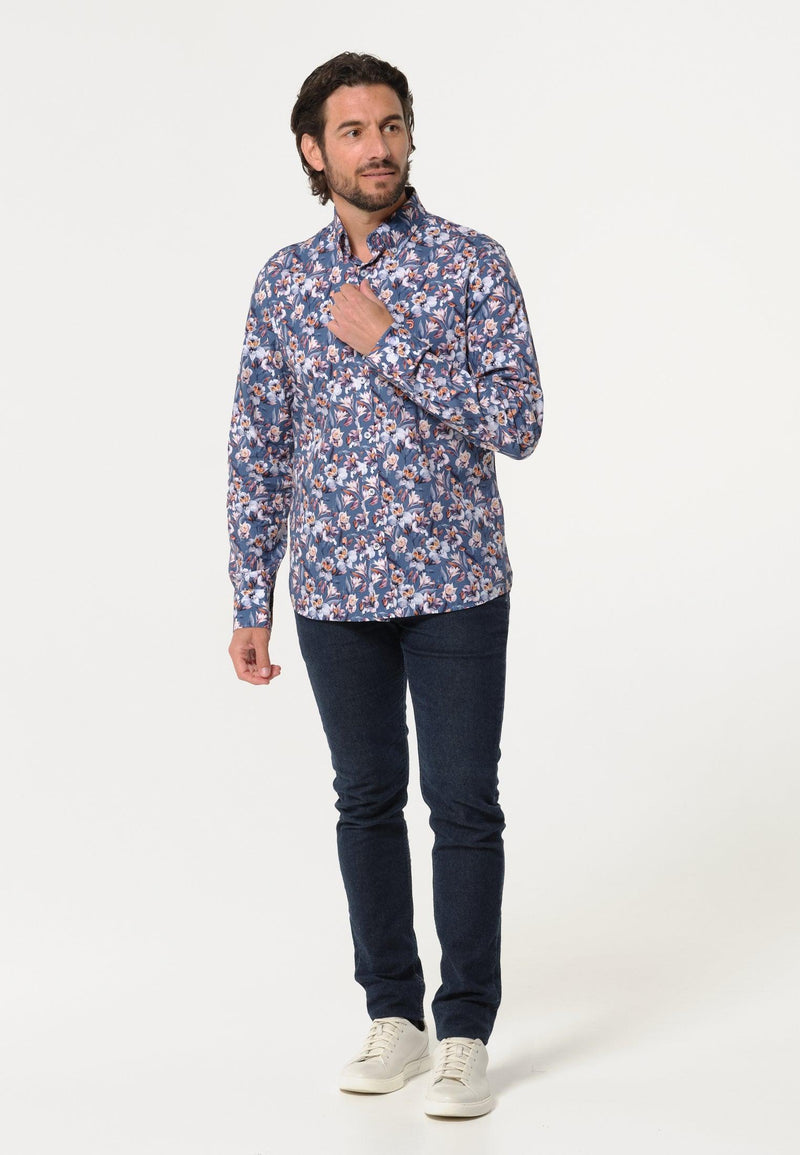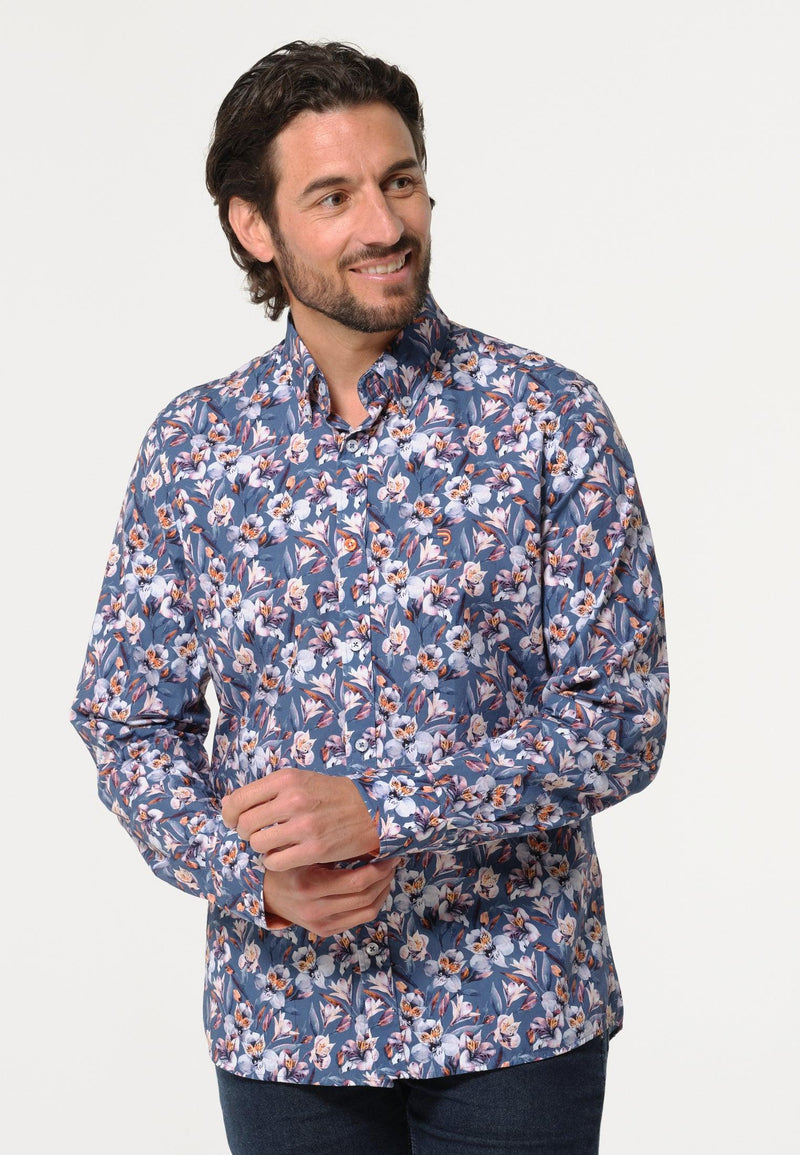 Chemise homme bleue longues manches motifs fleuris