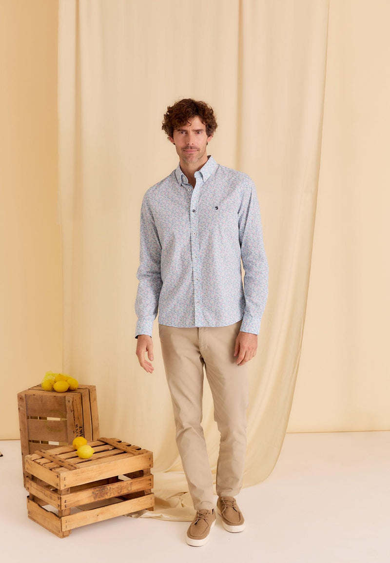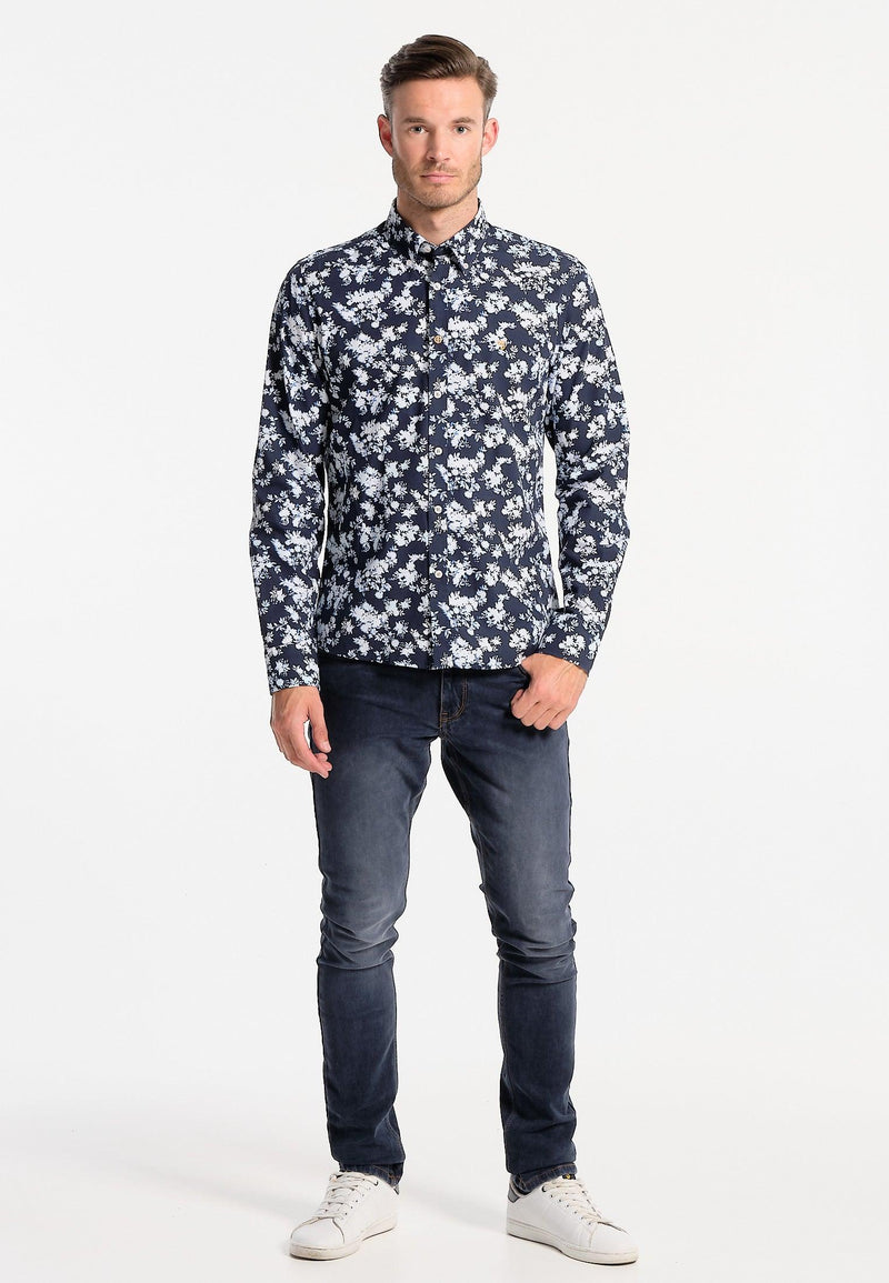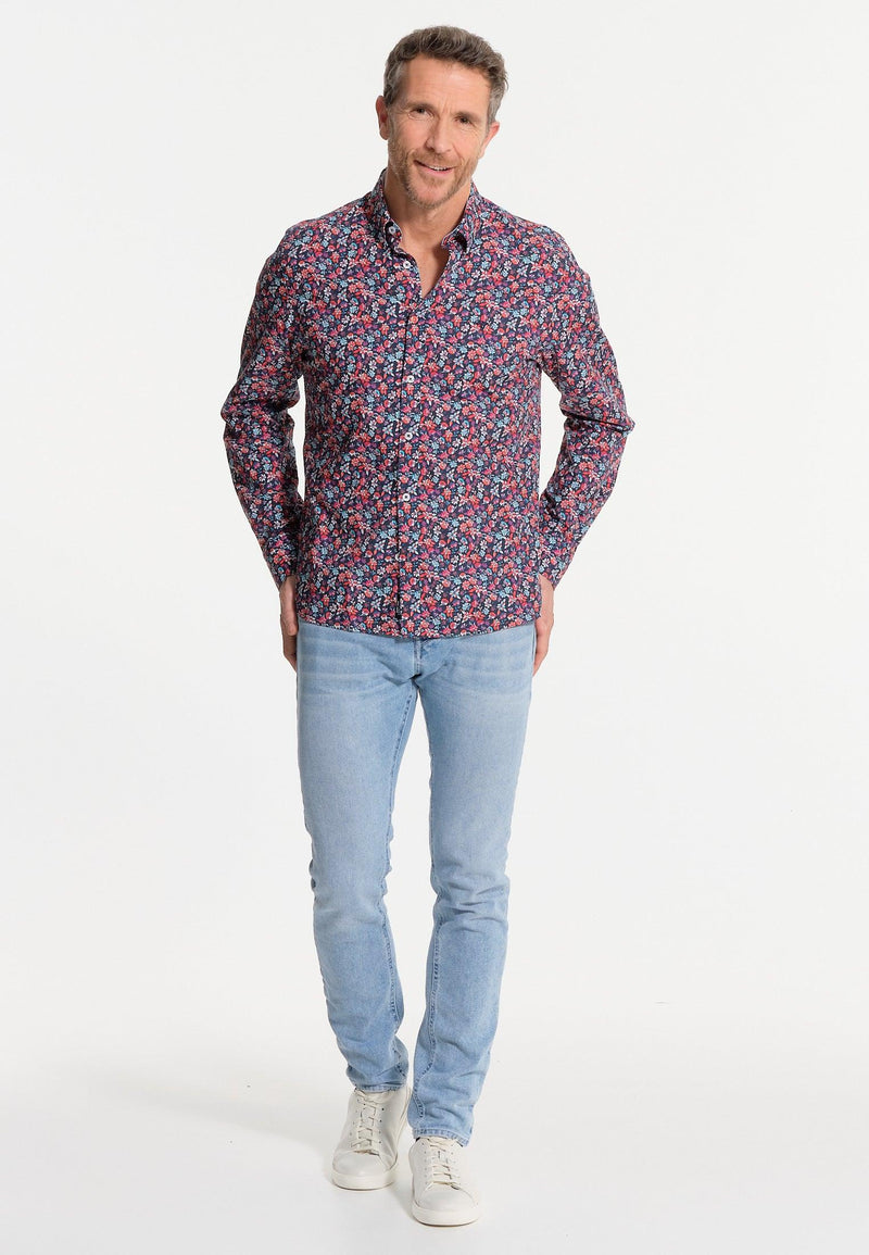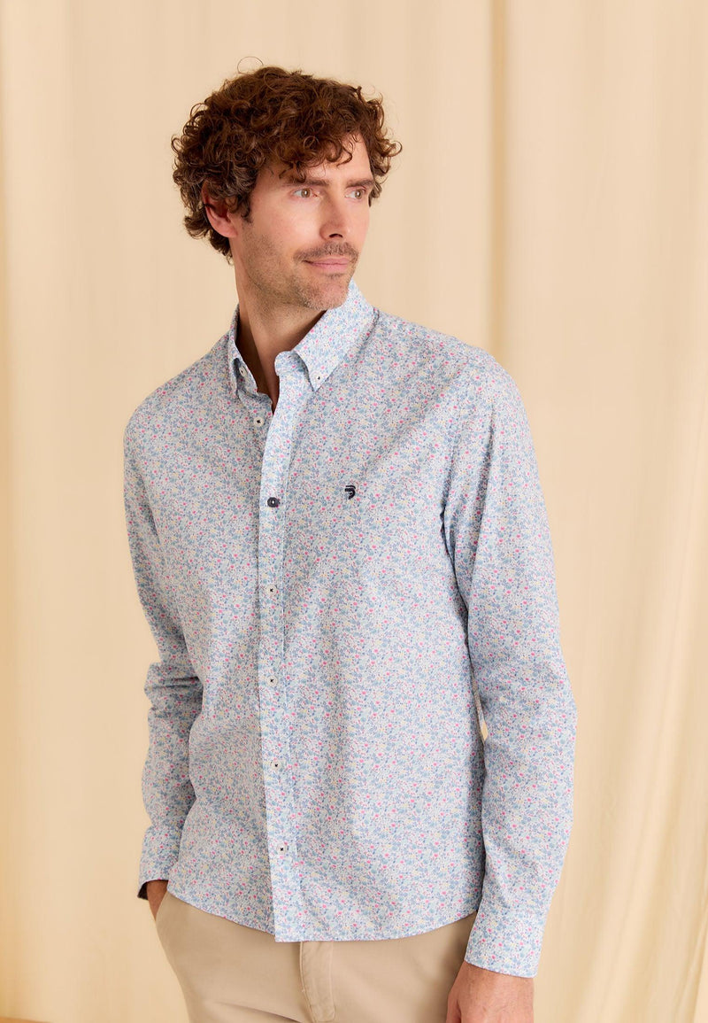 Chemise homme bleue longues manches motifs fleuris