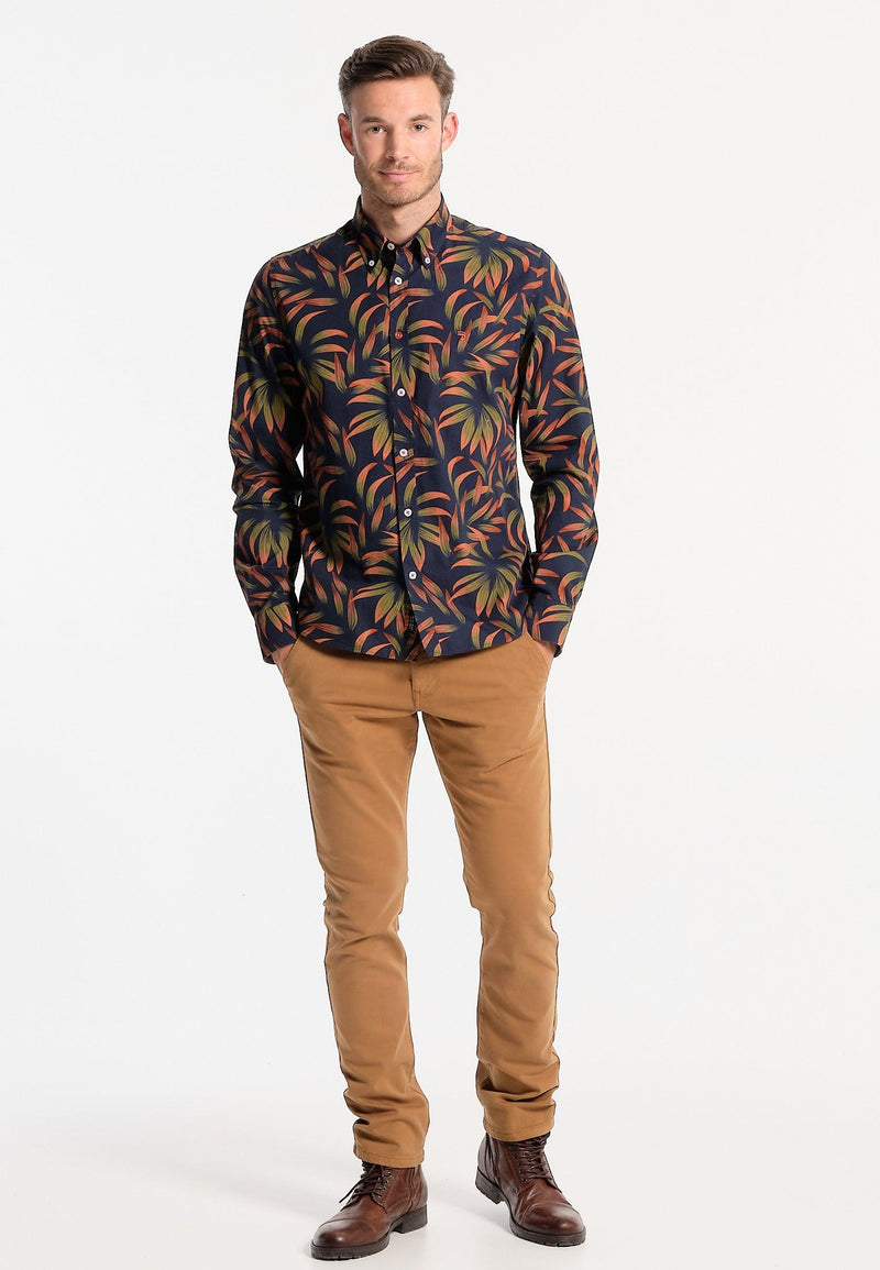 Chemise homme bleue marine avec grandes feuilles