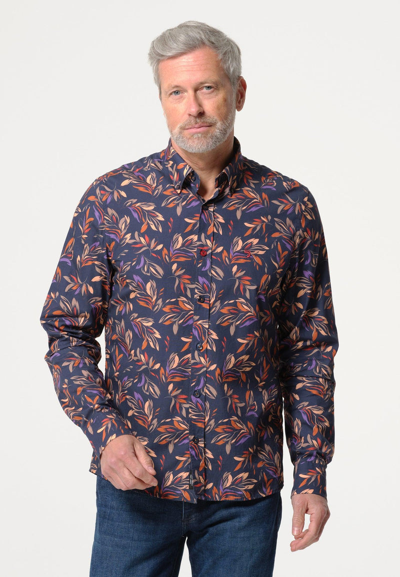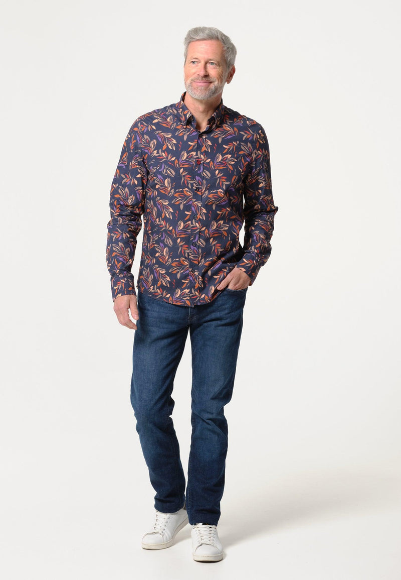 Chemise homme bleue marine avec feuilles couleurs automnales