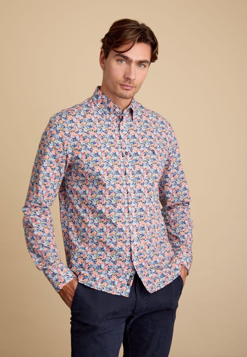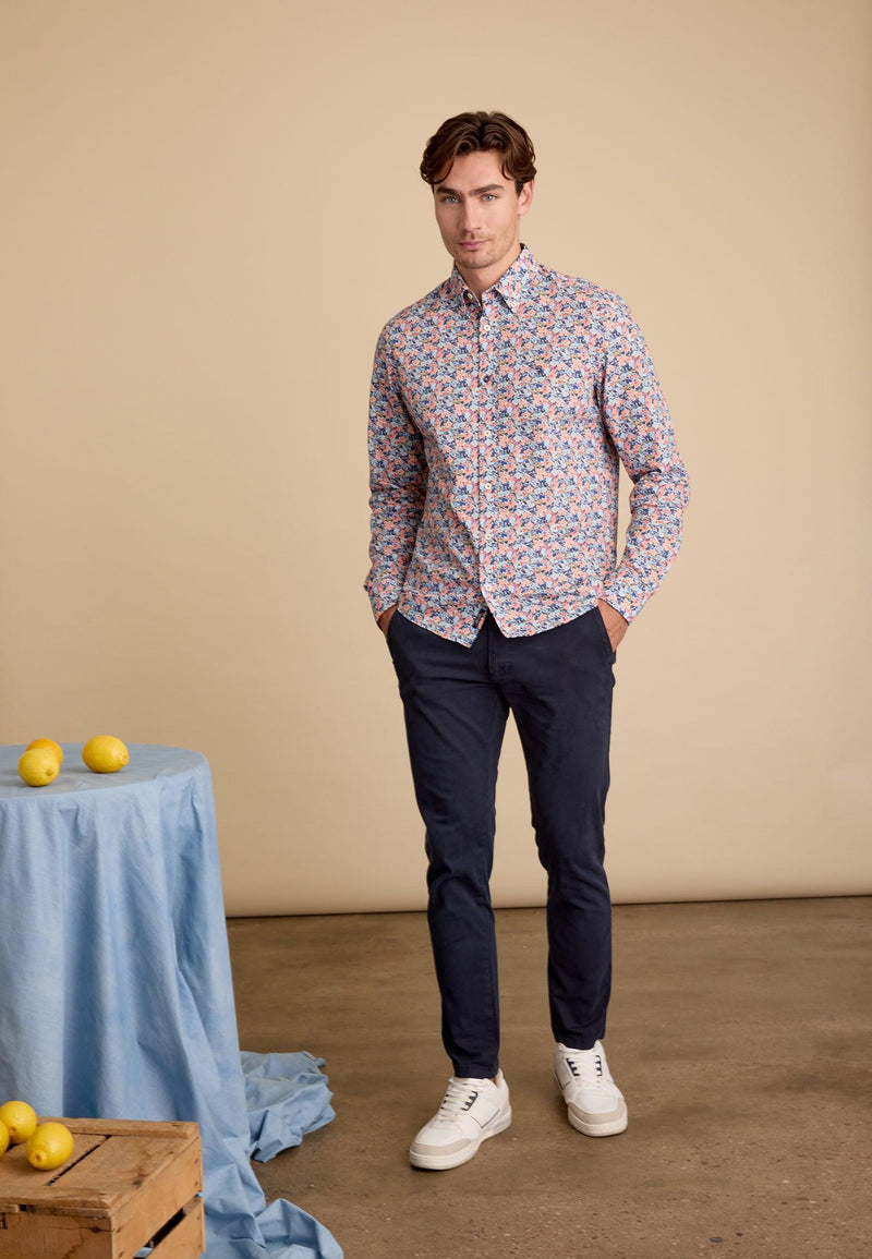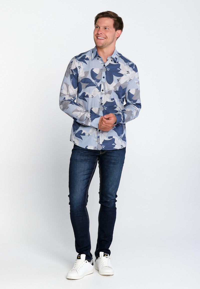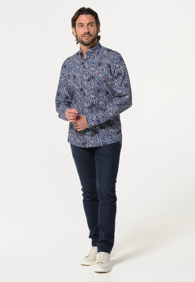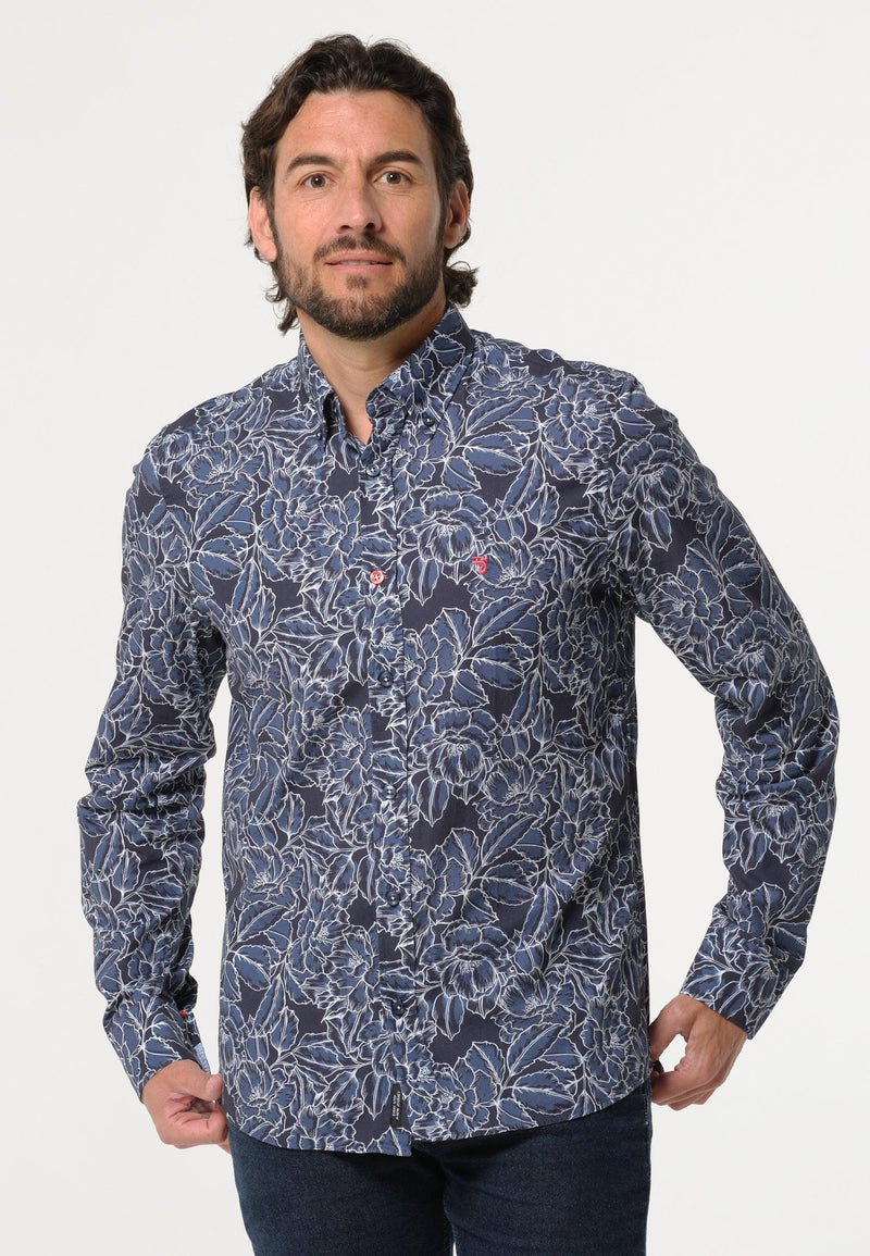 Chemise homme longues manches bleue marine et imprimé palmiers