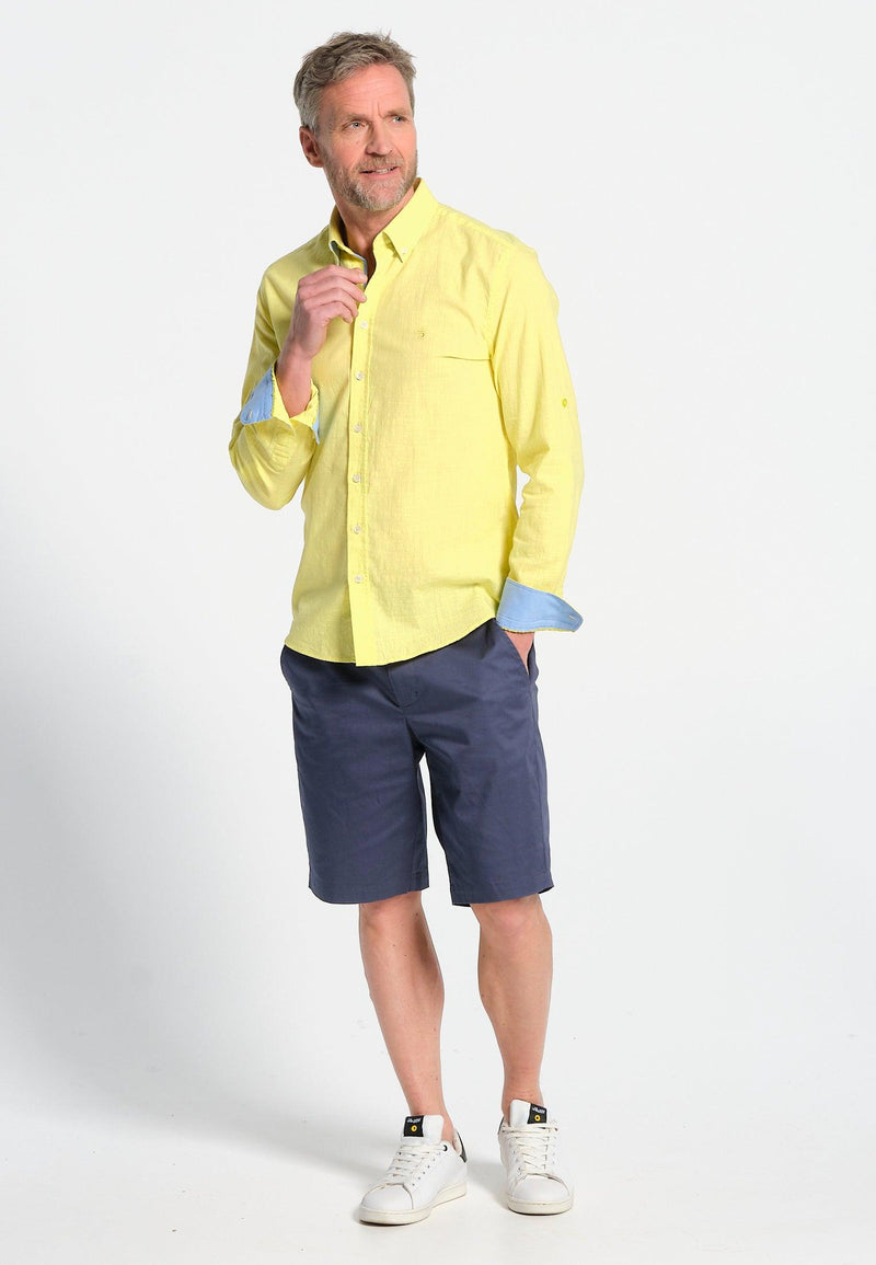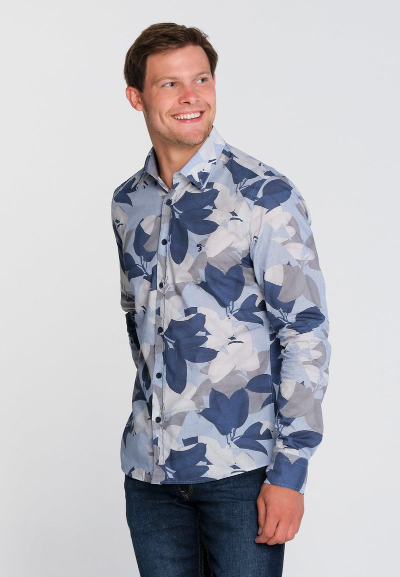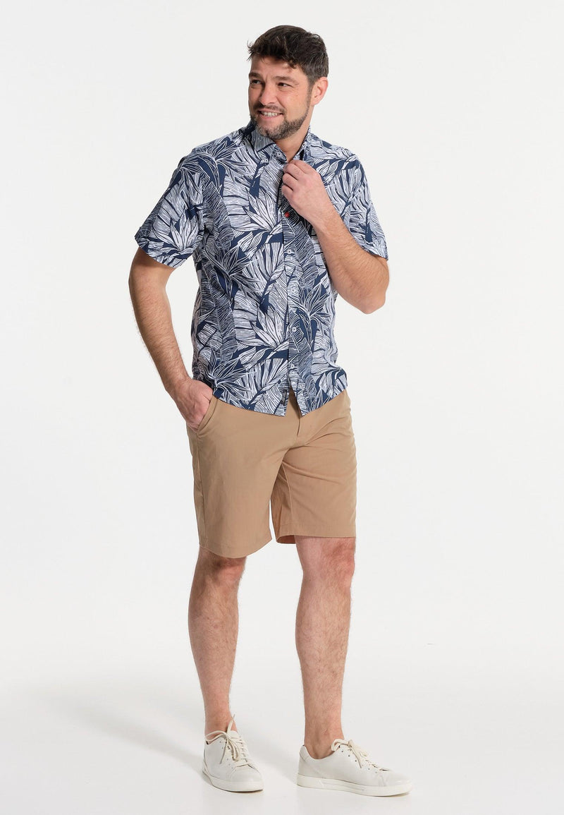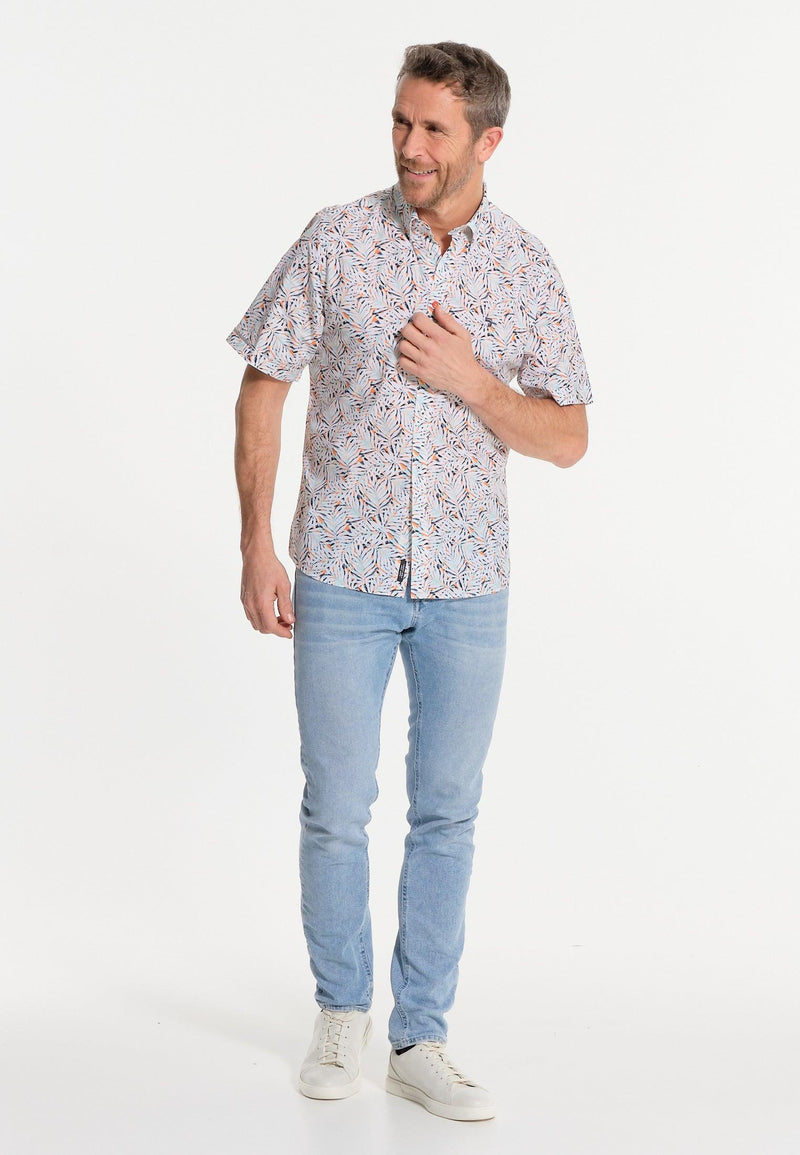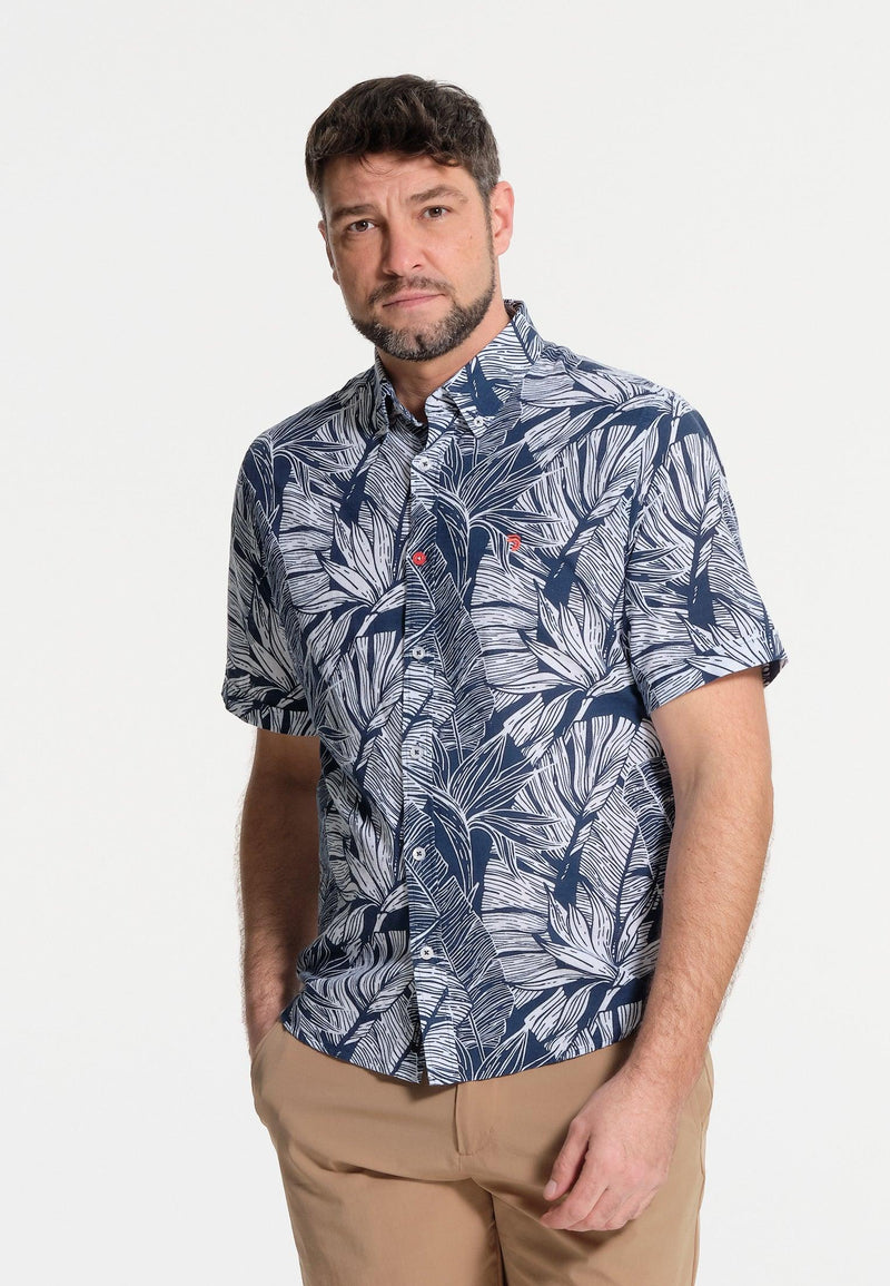 Chemise homme manches courtes bleue et feuilles en dégradé - effet lin