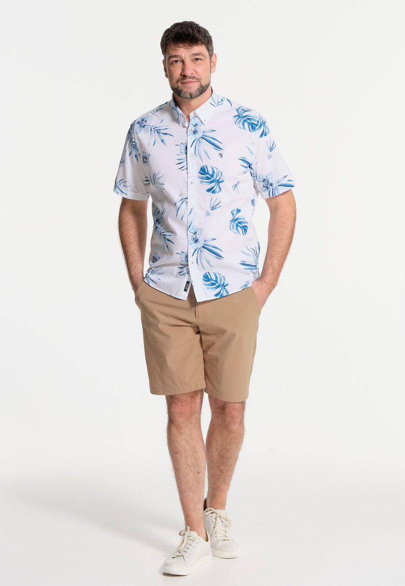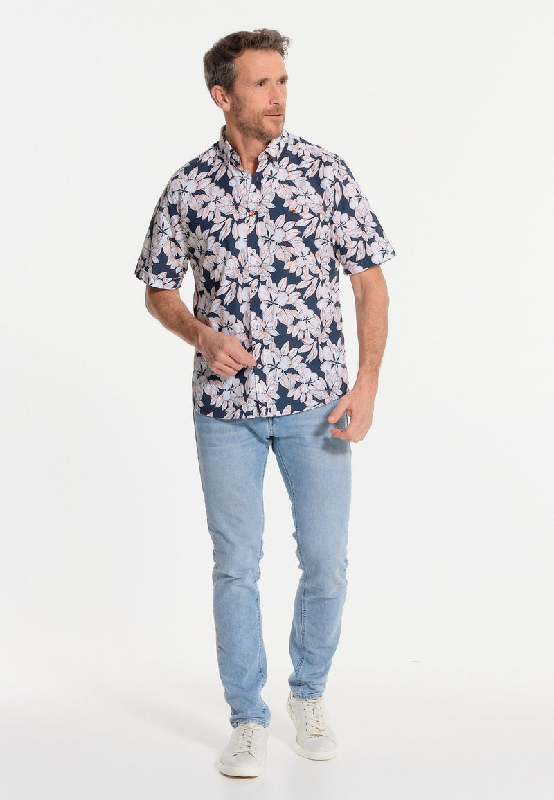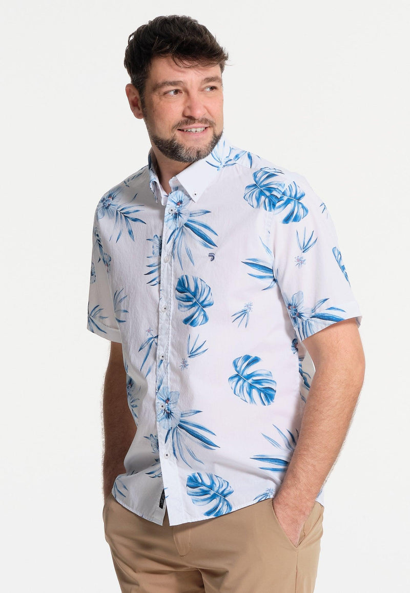 Chemise homme manches courtes bleue et grosses fleurs blanches