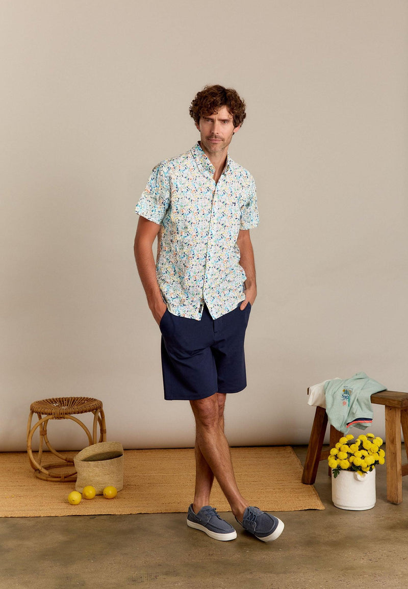 Chemise homme manches courtes turquoise et végétaux - effet lin