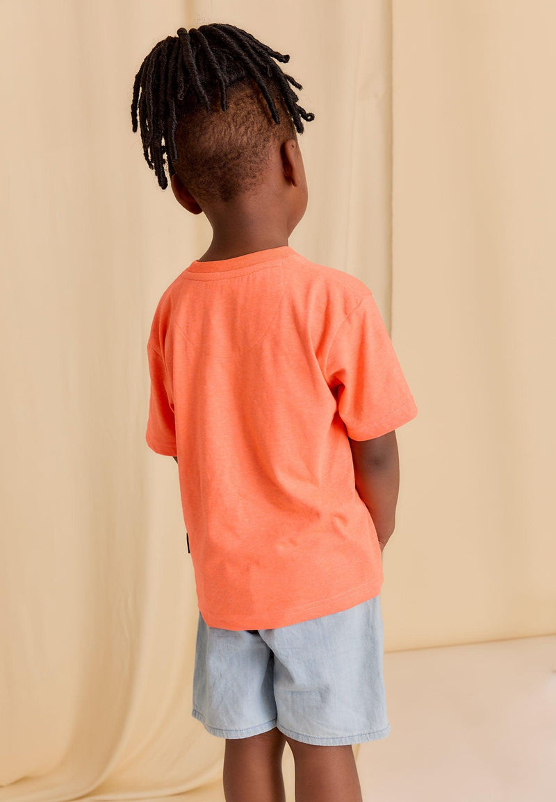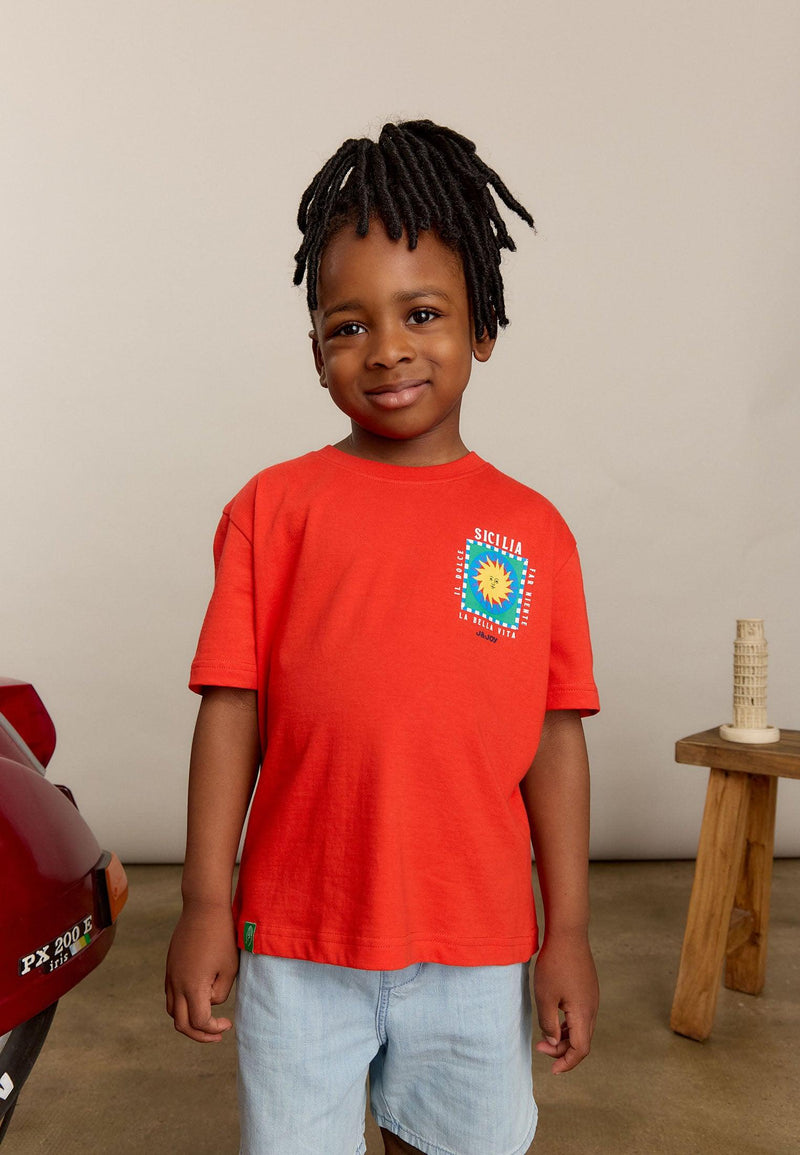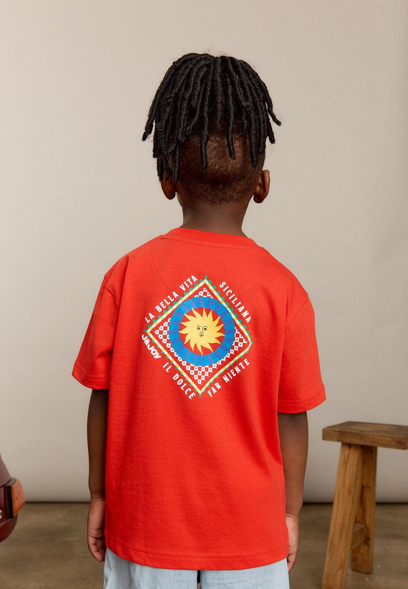 T-shirt garçon rouge logo soleil sur la poitrine et dans le dos