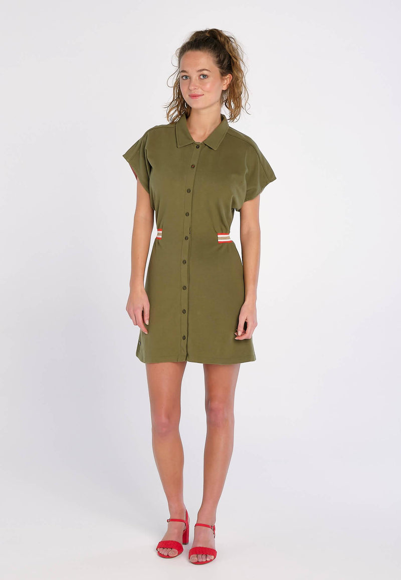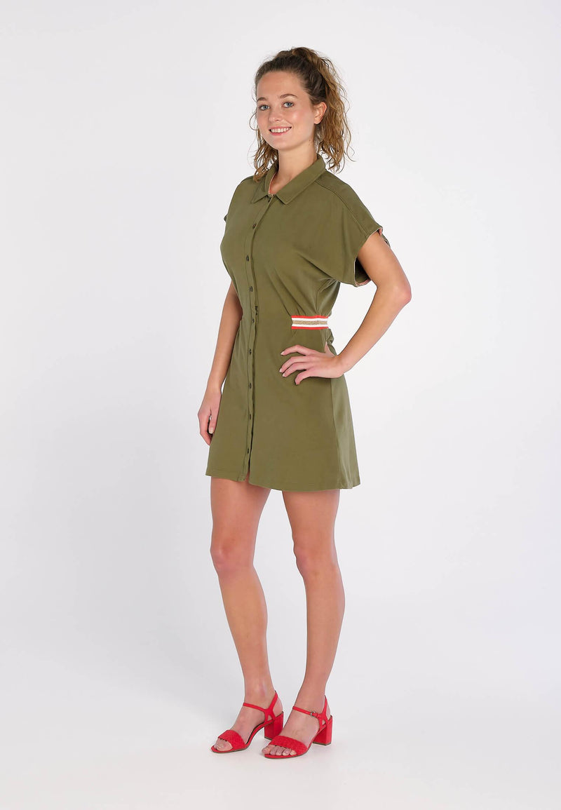 Vloeiende kaki damesjurk, 3/4 mouwen en gevlochten riem in de taille