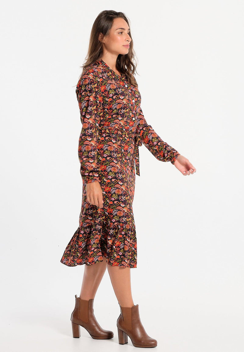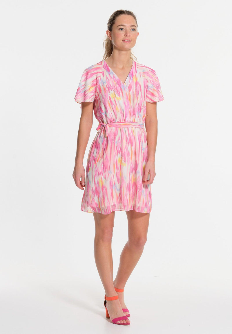 Lange soepelvallende wikkeljurk voor dames met strik en kleurrijke microprint