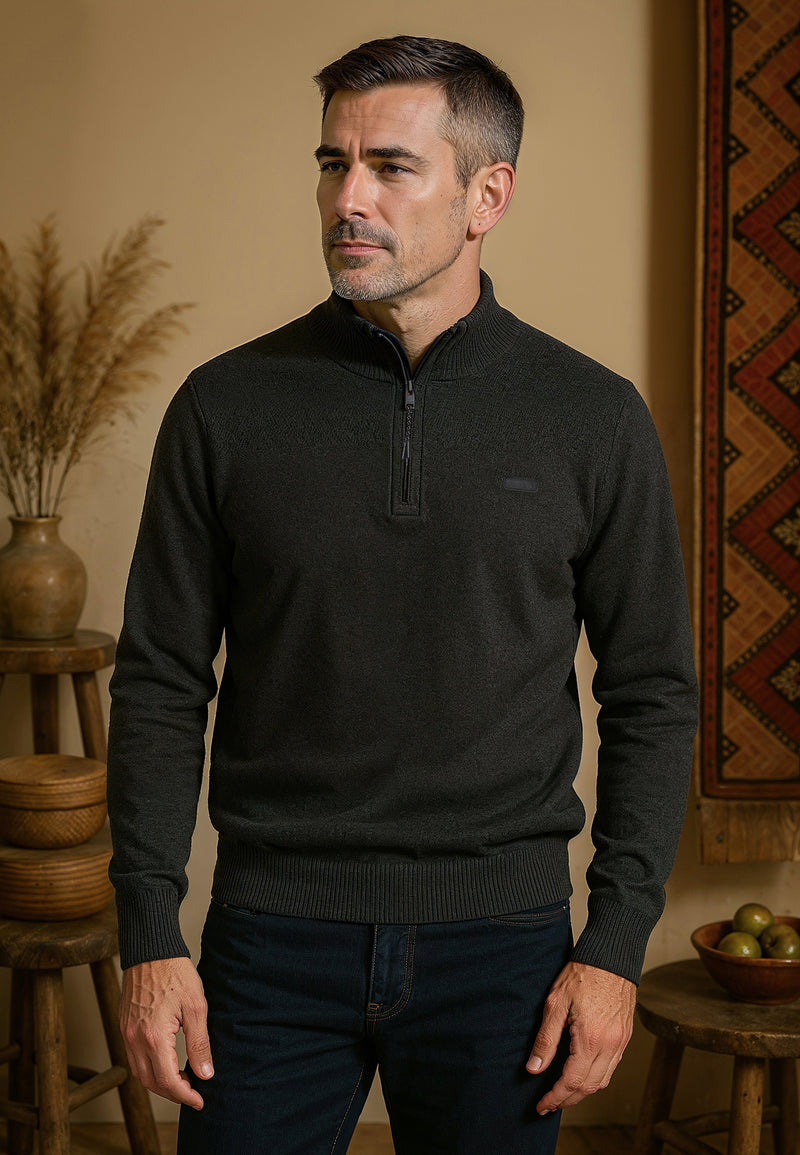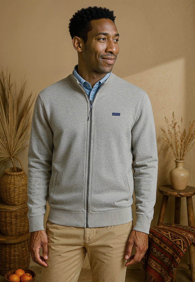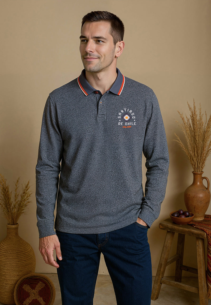 Polo homme longues manches bleu chiné avec logo Santiago dans le dos