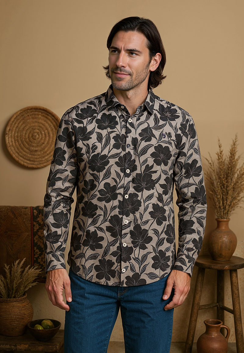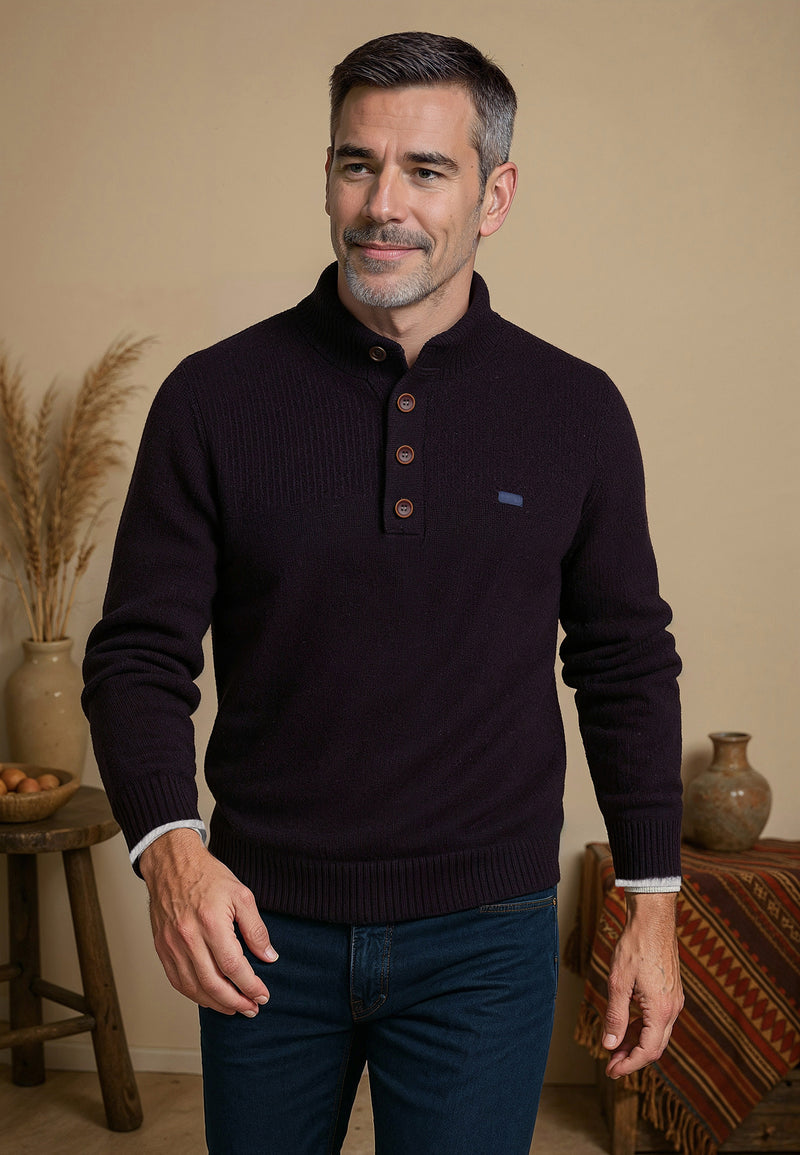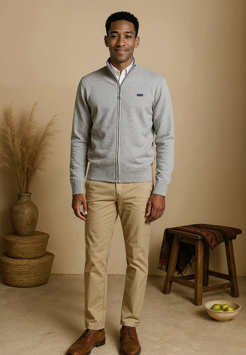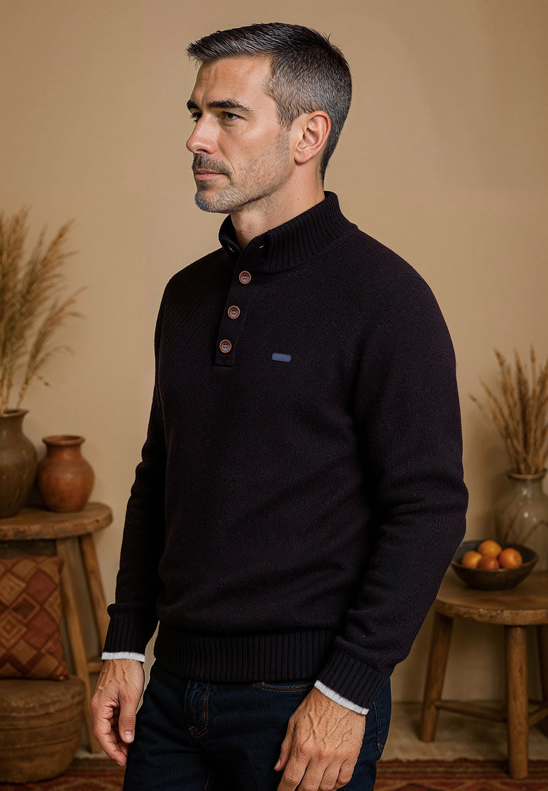 Polo homme longues manches bleu chiné avec logo Santiago dans le dos