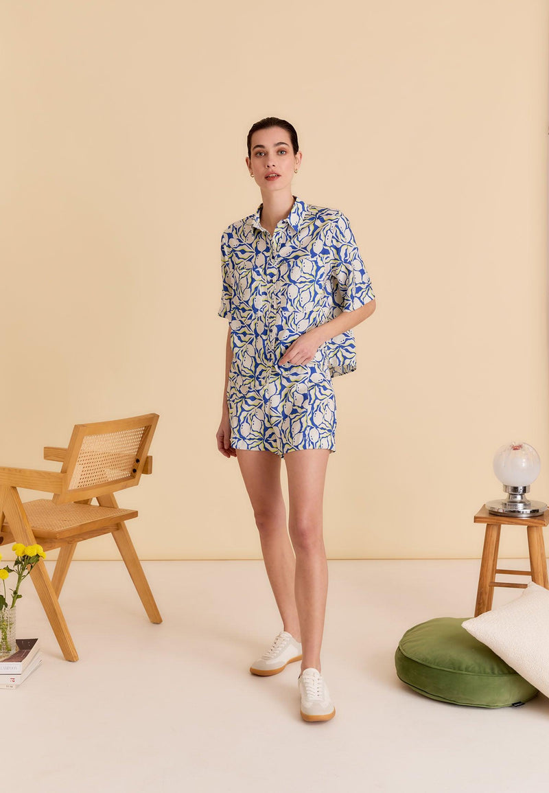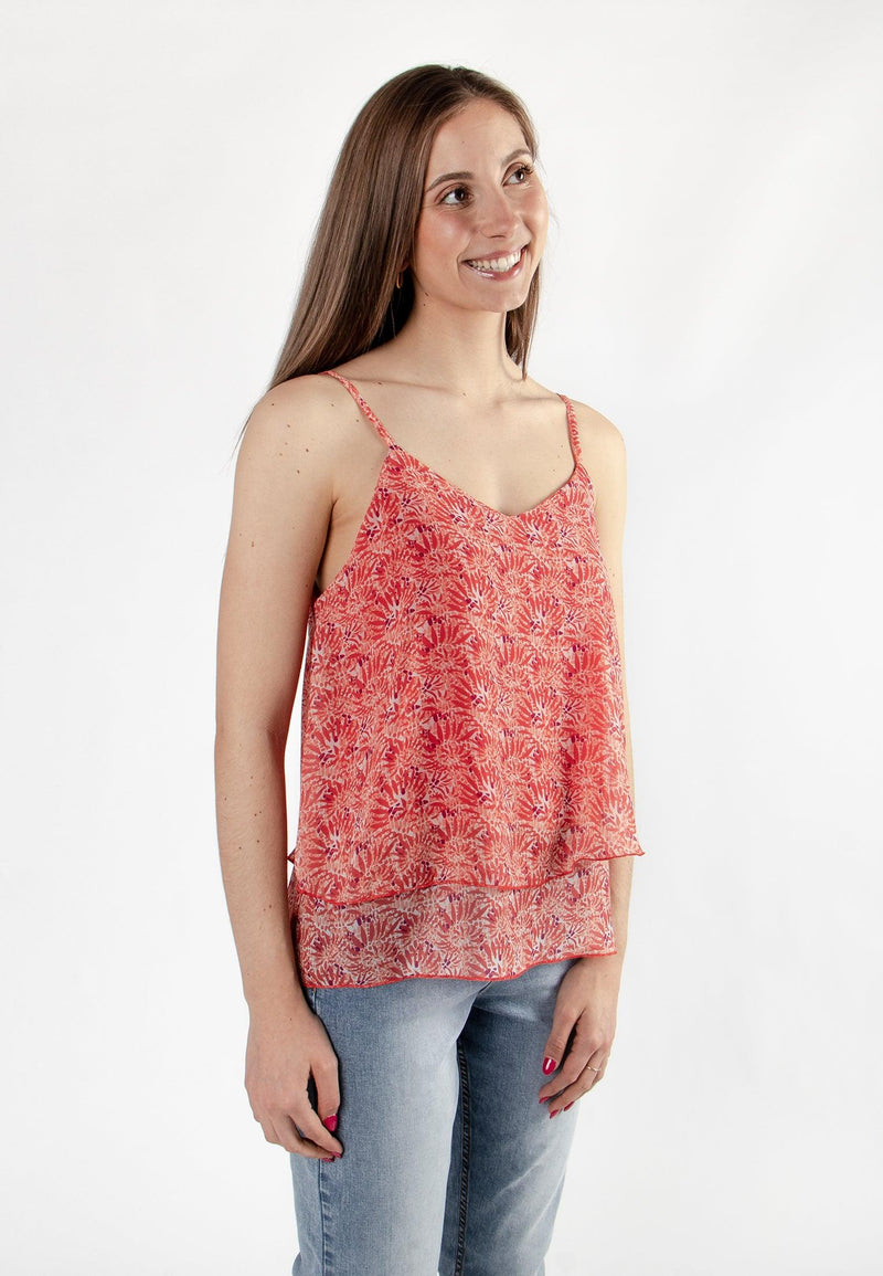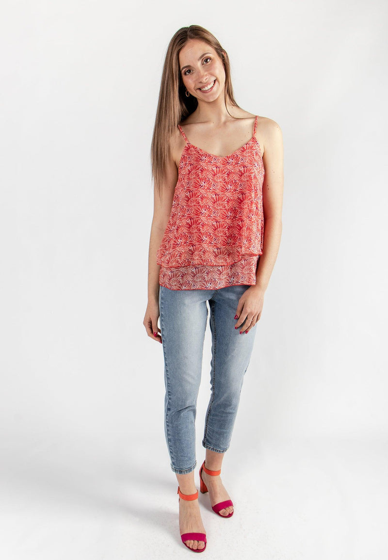 Damestop met koraalkleurige bloemenprint en dunne bandjes