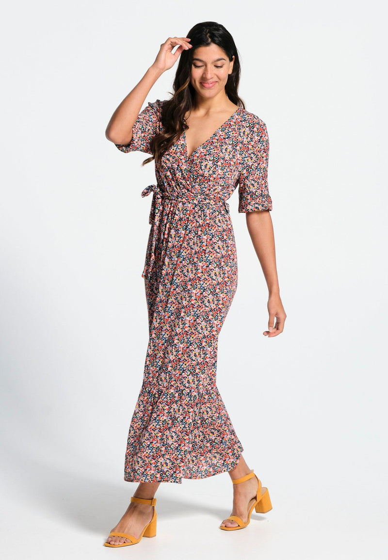 Lange damesjurk met V-hals, overslag, elastische taille, 3/4 mouwen