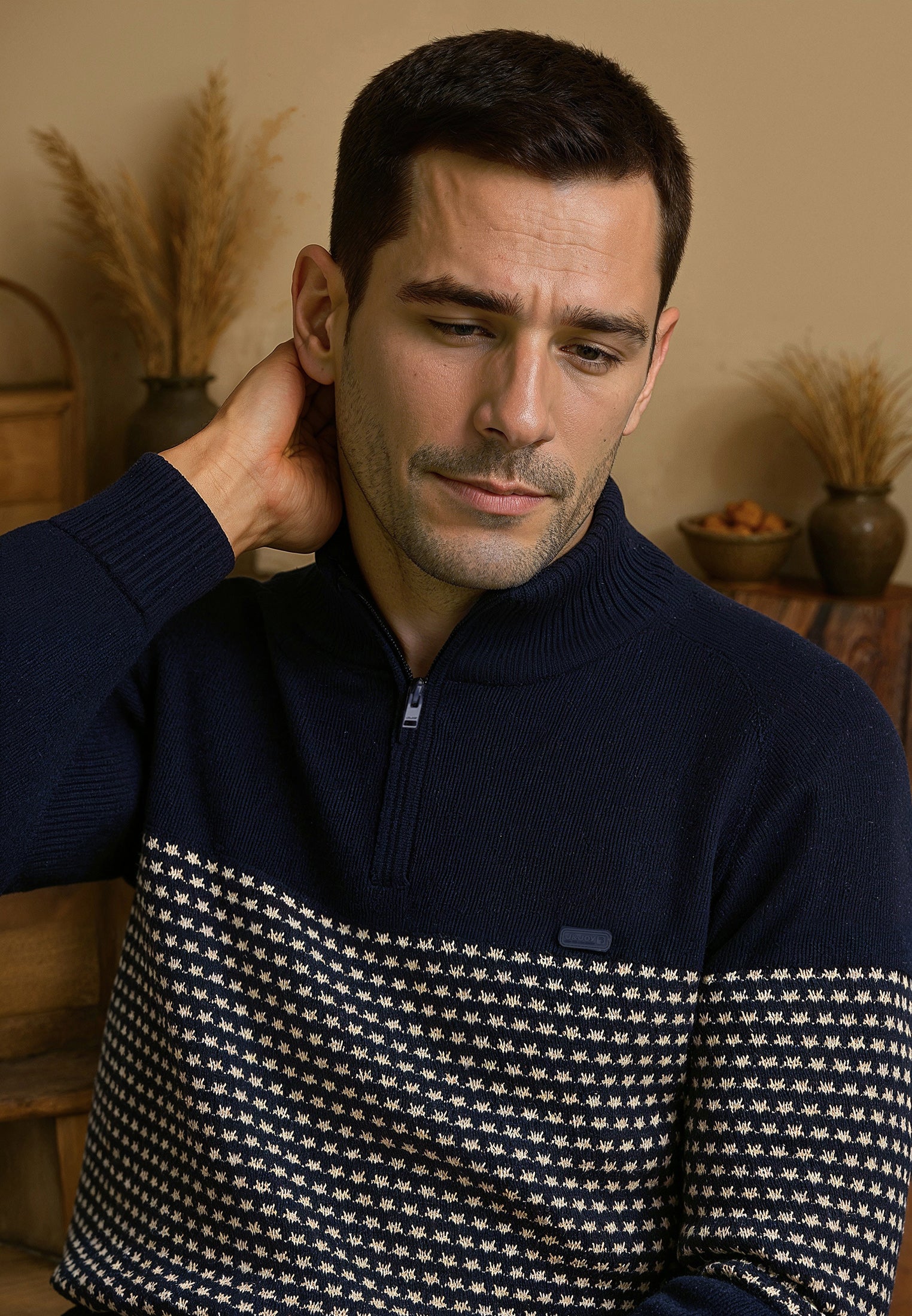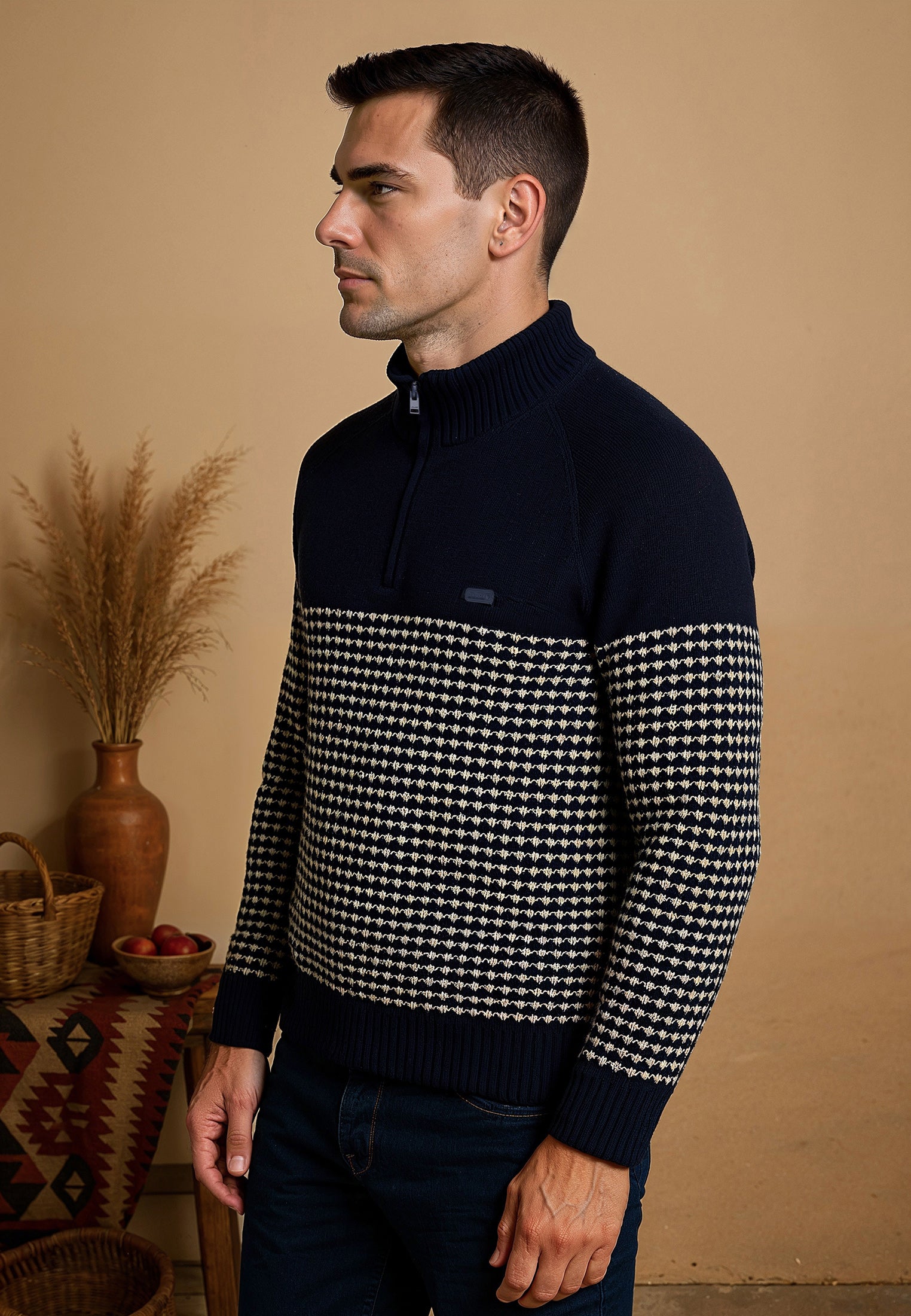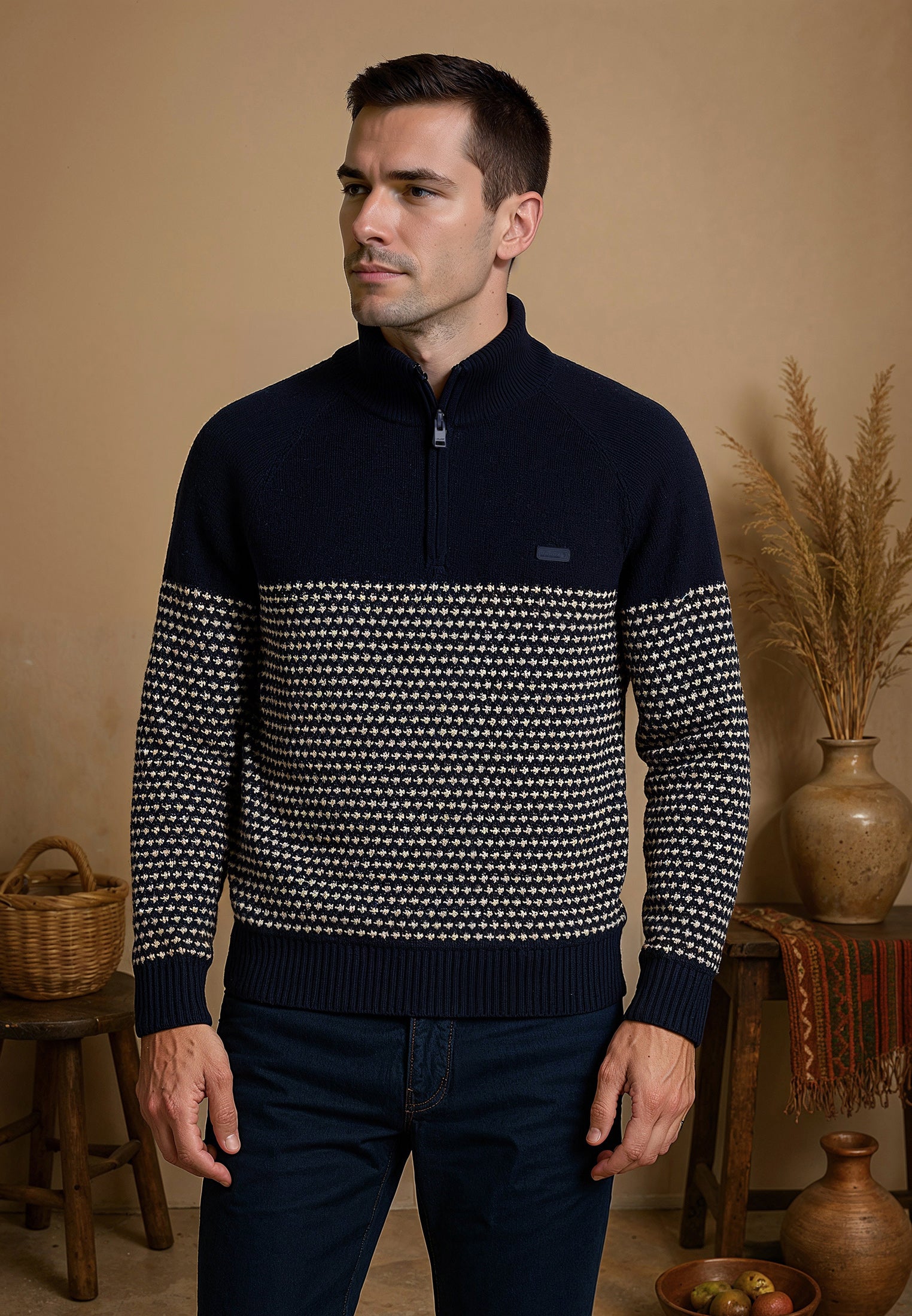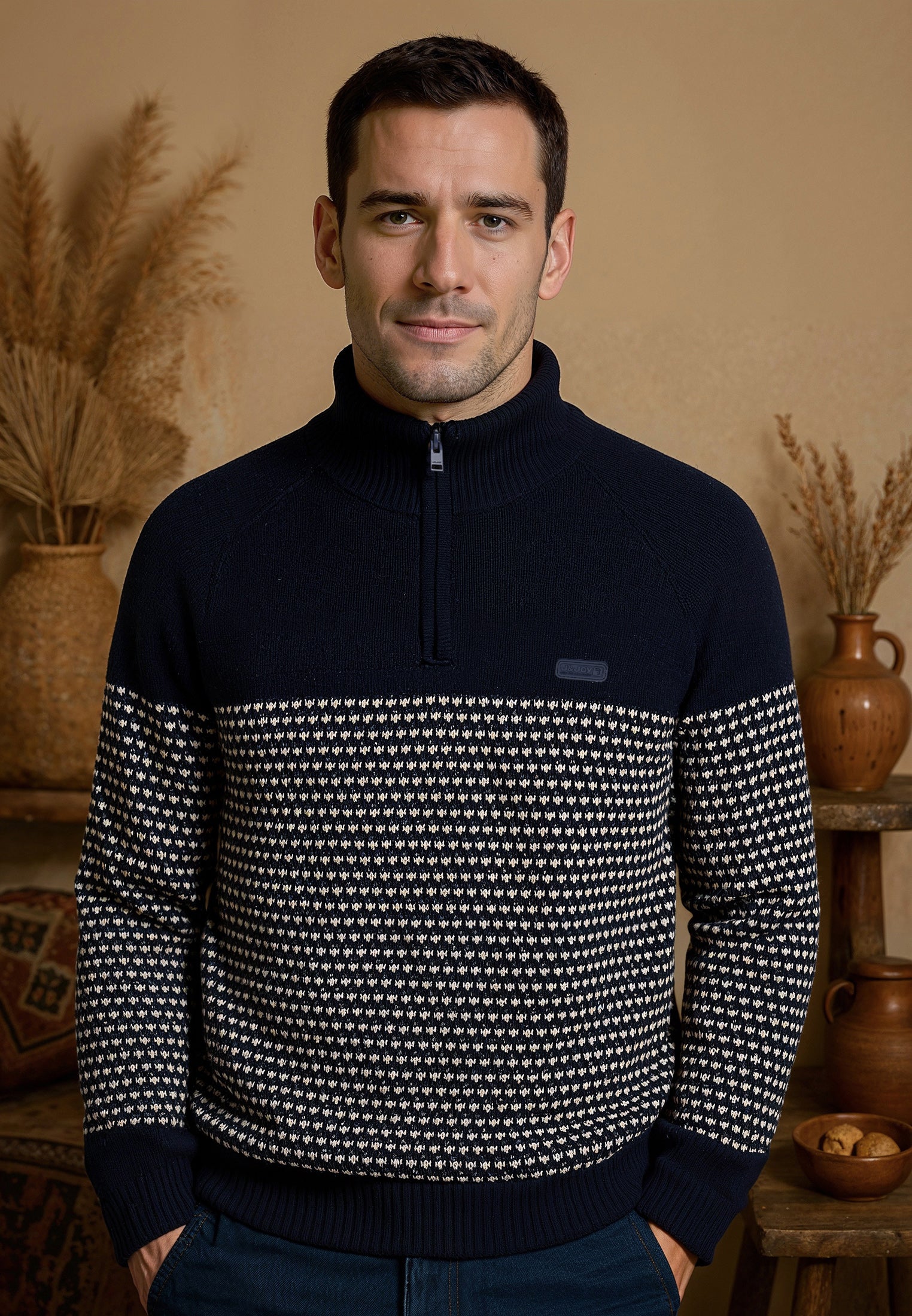 Optez pour un style élégant et confortable avec ce pull homme en deux textures inspiré par la majesté de la Cordillère des Andes. Fabriqué à partir d'un mélange de 60% coton et 40% acrylique, ce pull offre à la fois chaleur et douceur. Sa coupe droite et son col montant zippé ajoutent une touche moderne, tandis que les bords et poignets côtelés stretch offrent un ajustement parfait. Les manches longues garantissent une chaleur supplémentaire, et le logo J&JOY gommé sur le cœur témoigne de l'authenticité du produit. Associez confort et style avec ce pull bleu polyvalent, parfait pour toutes les occasions. Commandez dès maintenant et ajoutez une pièce incontournable à votre garde-robe d'hiver.