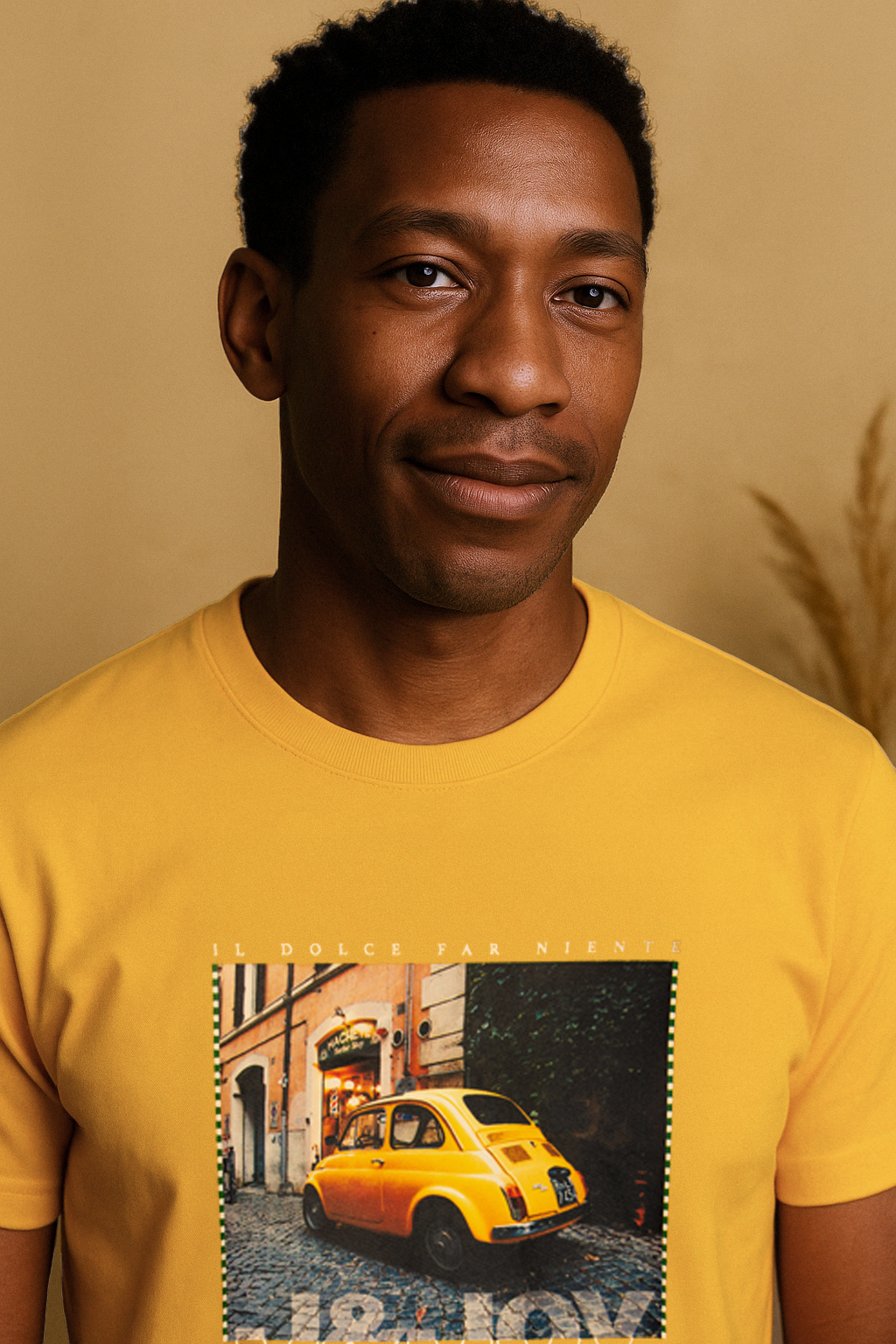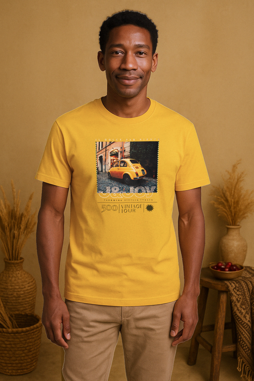 Optez pour un look estival et plein de caractère avec ce t-shirt homme jaune, inspiré par l'atmosphère ensoleillée de la Sicile. Fabriqué à partir de 100% coton, ce t-shirt offre un confort exceptionnel et une coupe droite flatteuse. Le motif de voiture imprimé sur le devant ajoute une touche d'originalité et de style, tandis que le col rond uni ras du cou et les bords côtelés et stylisés apportent une finition soignée. Les ourlets et bords surpiqués témoignent de l'attention portée aux détails, tandis que les manches courtes offrent une sensation de légèreté parfaite pour la saison estivale. Ajoutez une touche de soleil à votre garde-robe dès maintenant avec ce t-shirt unique en son genre.
