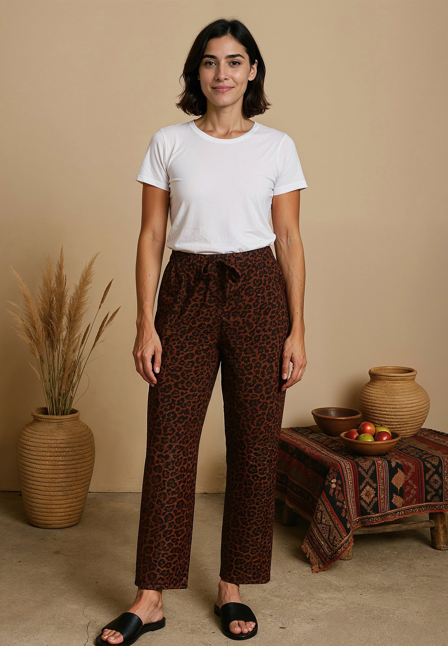 Optez pour un look sauvage et tendance avec ce pantalon femme léopard, inspiré par l'effervescence de Santiago. Fabriqué en 100% viscose, ce pantalon offre un confort inégalé et une coupe droite flatteuse. Le motif léopard audacieux apporte une touche d'audace à votre tenue, tandis que la taille élastiquée avec cordon garantit un ajustement parfait. Les 2 poches latérales ajoutent à la fois style et fonctionnalité. Que ce soit pour une journée décontractée ou une soirée animée, ce pantalon multicolore est un incontournable de la garde-robe. Commandez dès maintenant pour un look félin irrésistible et une élégance sans pareille.