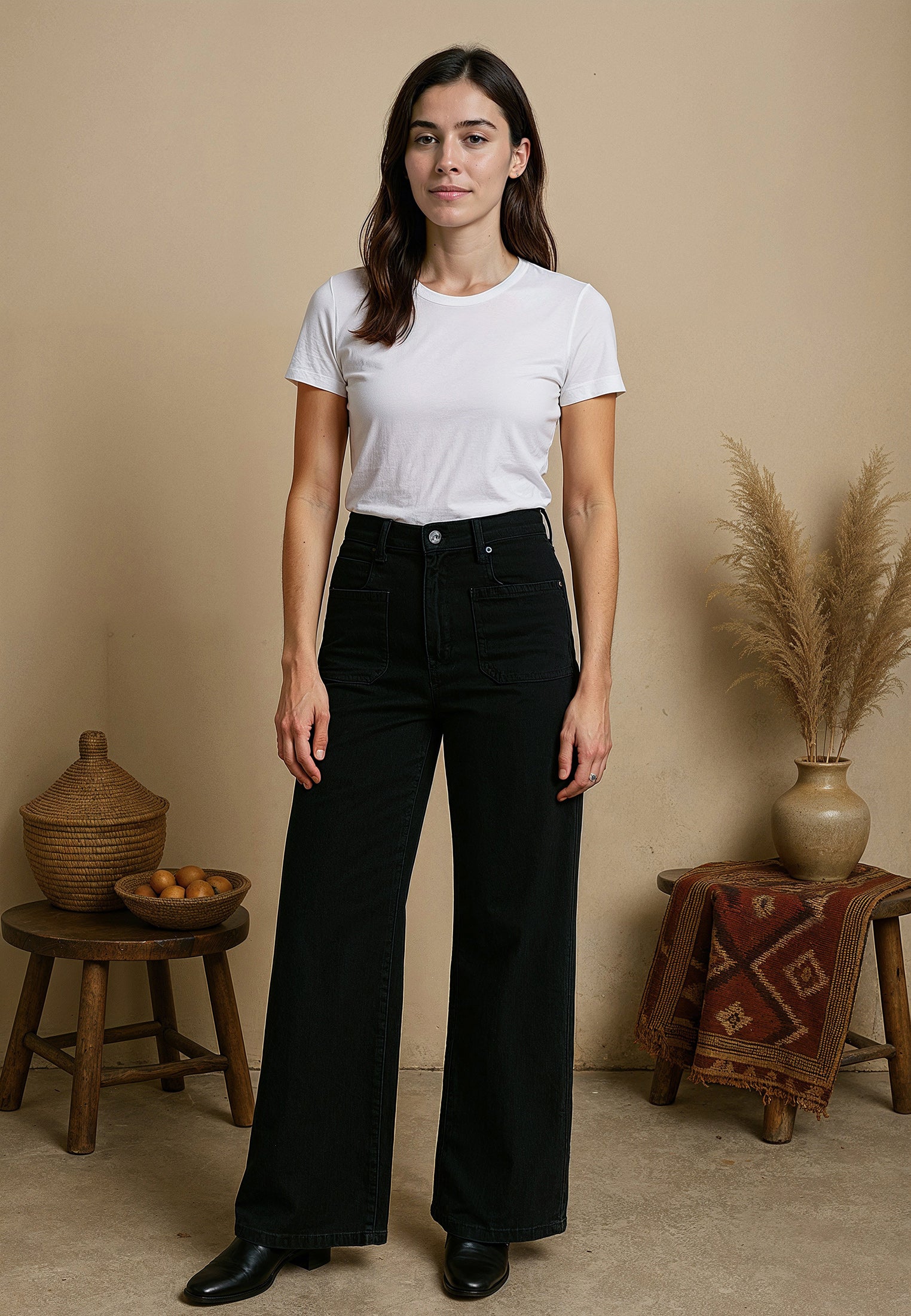- Pantalon femme bleu marine avec coupe évasée dans le bas, inspiré par la Cordillère des Andes
