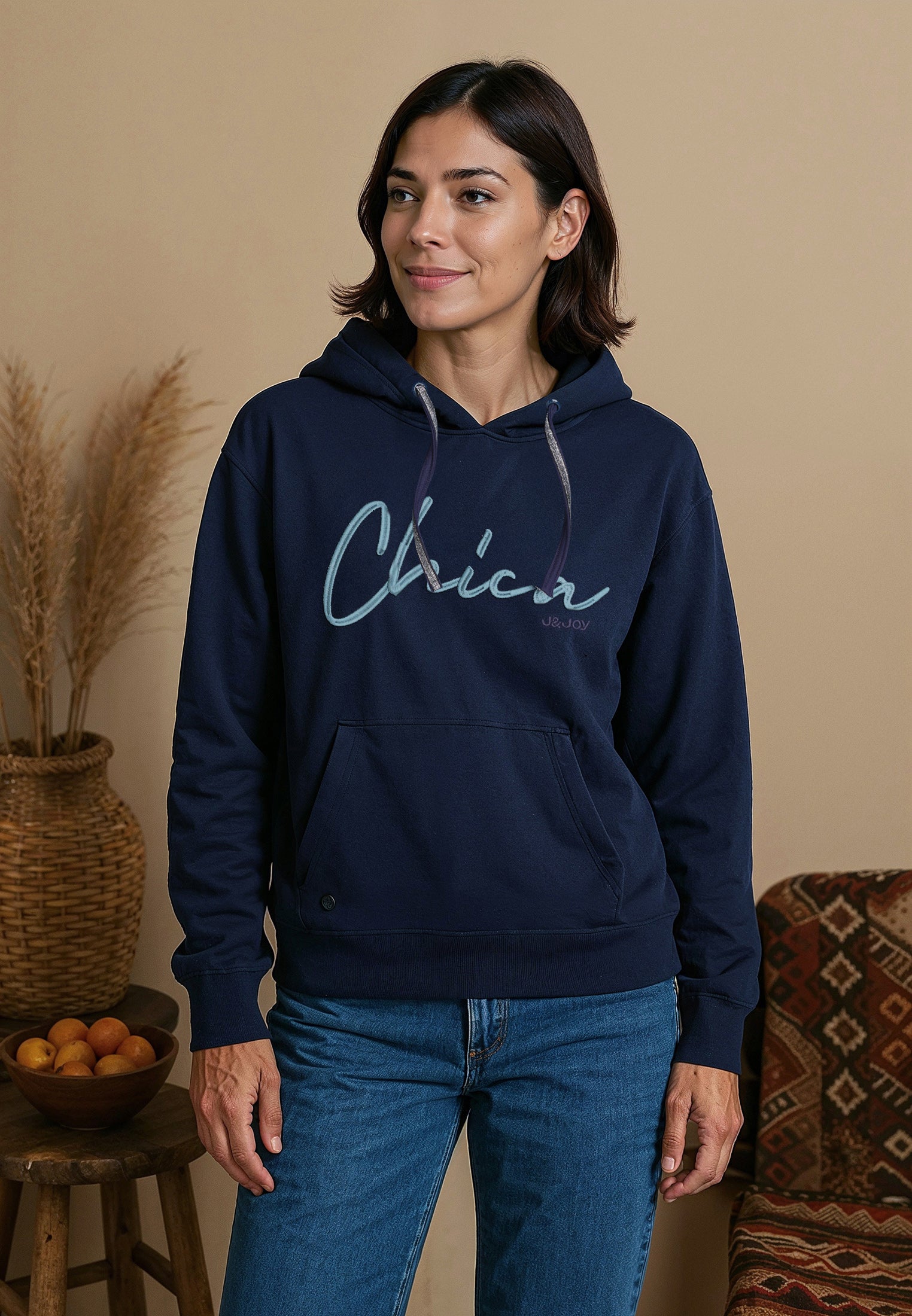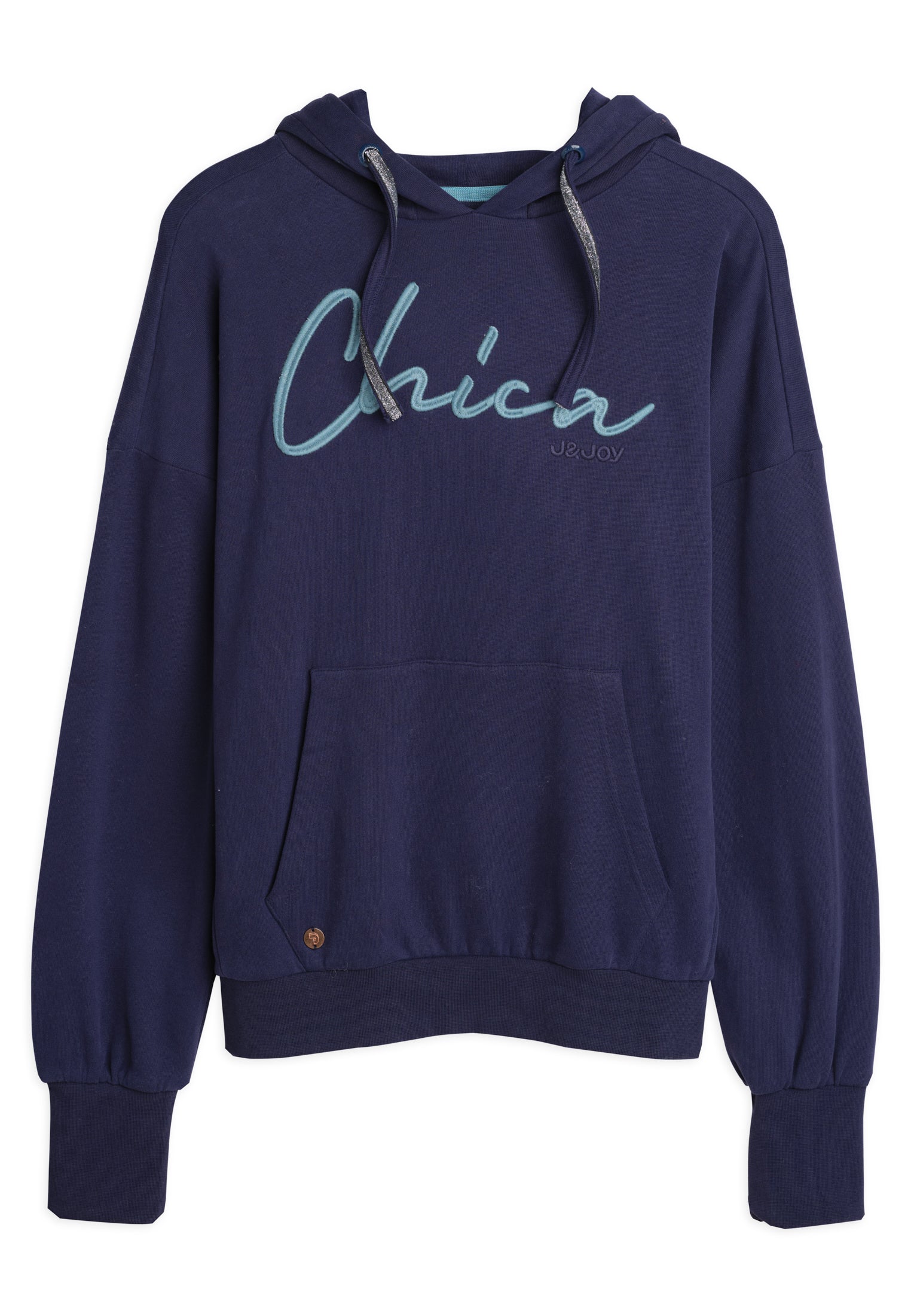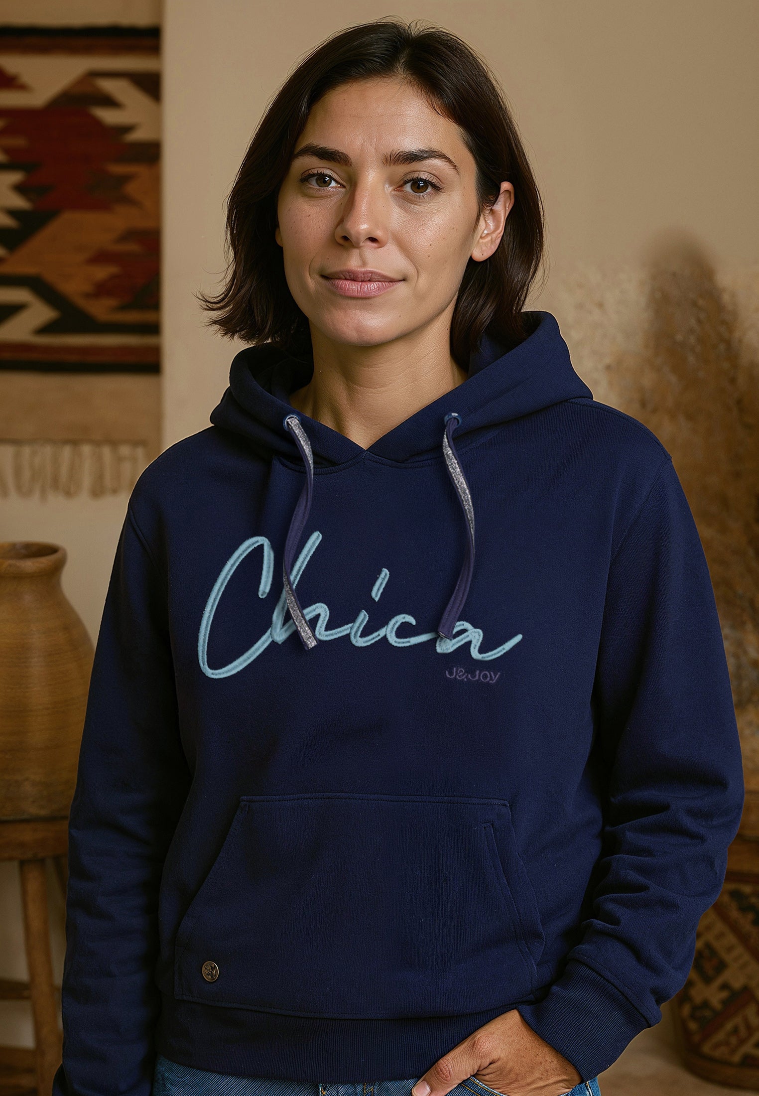 Optez pour un look décontracté et tendance avec ce sweatshirt femme bleu inspiré par la majesté de la Cordillère des Andes. Confectionné en 100% coton, ce pull offre un confort inégalé et une coupe resserrée à la taille pour une silhouette flatteuse. La capuche avec cordons pailletés de serrage ajoute une touche d'éclat, tandis que le texte "chica" et le col rond offrent un style décontracté et moderne. Les poignets resserrés et la poche kangourou complètent le look avec praticité et confort. Enfin, le logo J&JOY en bas à droite témoigne de l'authenticité de ce sweatshirt. Ajoutez cette pièce incontournable à votre garde-robe dès maintenant!